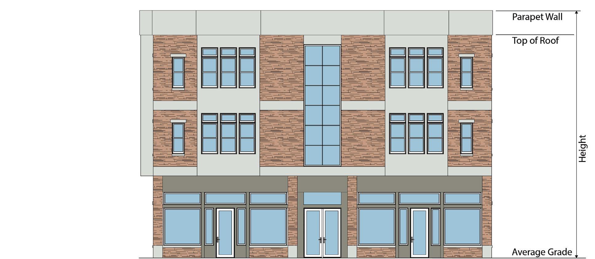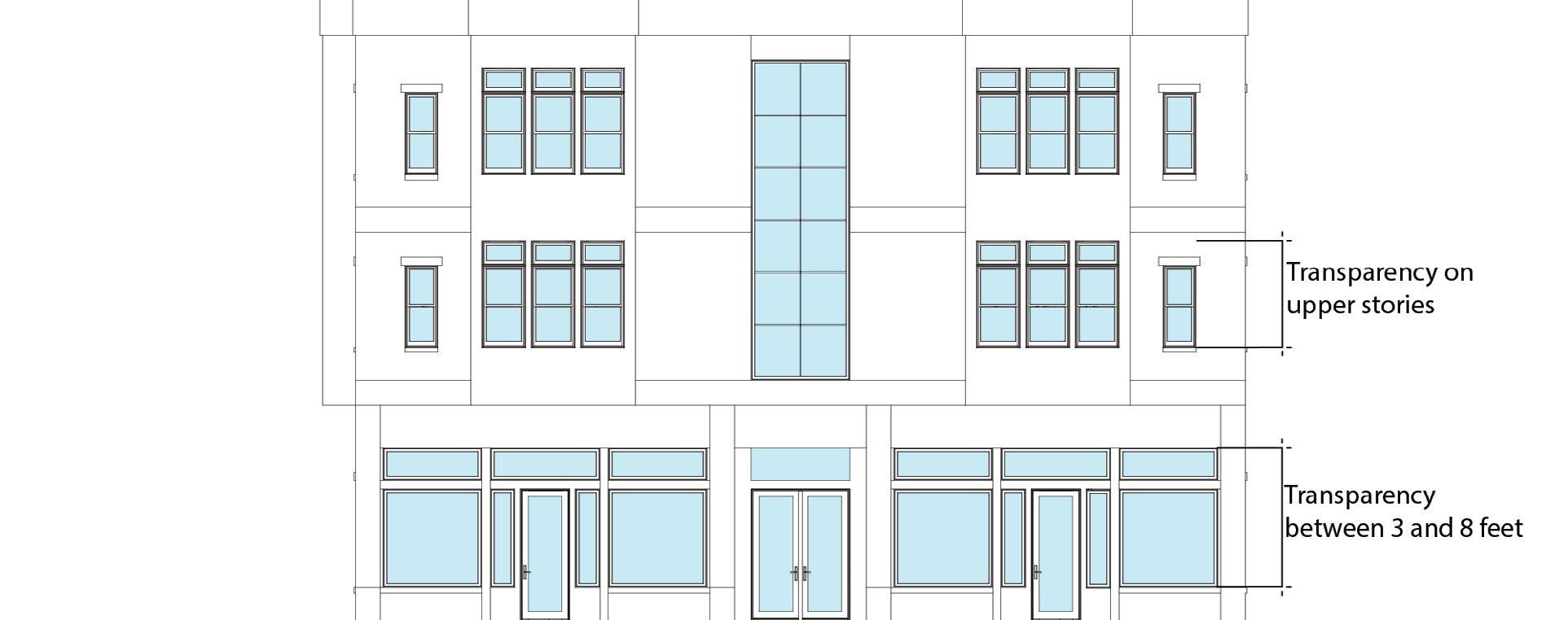 • Ensure buildings address the street and are used to define the corridor, promote pedestrian scale, and reinforce a walkable framework to the district.