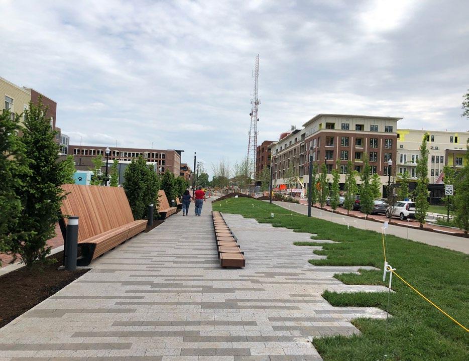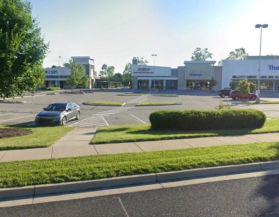A pedestrian path through the parking lot of the Rivers Edge retail development in Indianapolis.