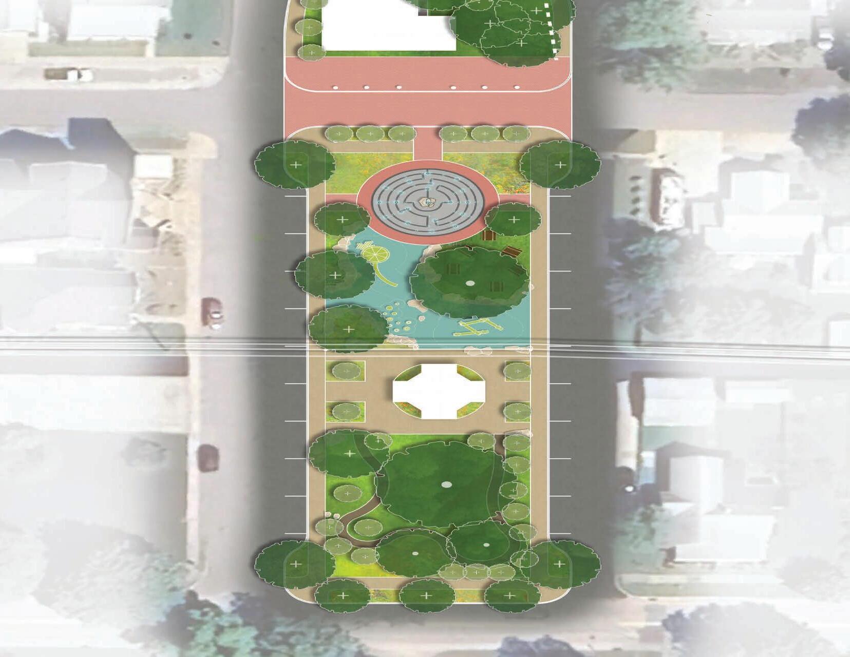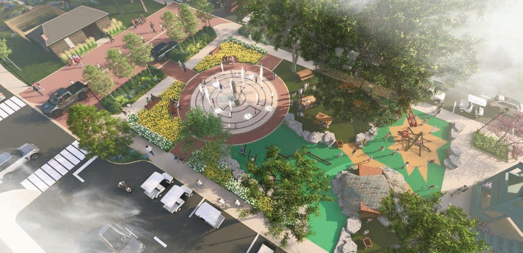 • Implementation of master plan, including playground, spray plaza, and hardscape improvements such as plazas, curbs, and onstreet parking