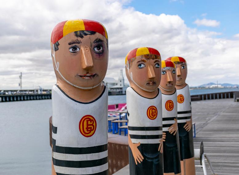 Created by the late Jan Mitchell from remnants of a demolished pier, each bollard depicts characters of importance to Geelong's history including explorers, First Nations families, performing artists, bathers, and lifesavers.