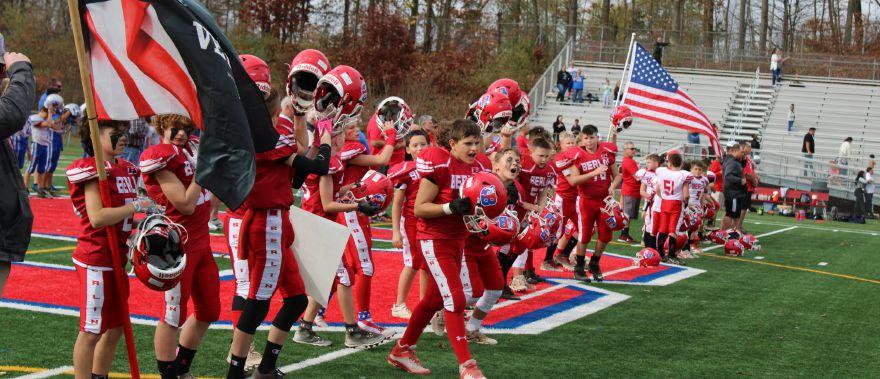 Colin Gish and his father, former Marine, Scott Gish, pose on the football field at Sage Park on Sunday, Nov. 6. With Veterans Day on the horizon, Berlin Bears Youth Football and Cheer took the opportunity to celebrate and honor members of the military before their games last weekend. See more photos inside.
