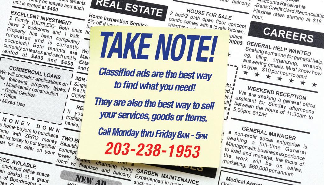 Call Monday thru Friday 8:30AM - 5PM /Classified Local listings online! GROW YOUR BUSINESS Advertise with us. 203-317-2312 Looking for a friend? Find litters of critters in Classifieds. A Classified ad is an easy way to sell your merchandise, and it’s easy on your wallet, too. Power Washing Electrical Services Roofing Handyperson Businesses & Services 203-238-1953 Get Listed. Get Calls. Get Results. Masonry Cleaning Services Landscaping Carpentry Gutters Moving and Storage Masonry Junk Removal Tree Services Handyperson Power Washing Roofing Attics and Basements Cleaned Home Improvements Painting Wallpapering