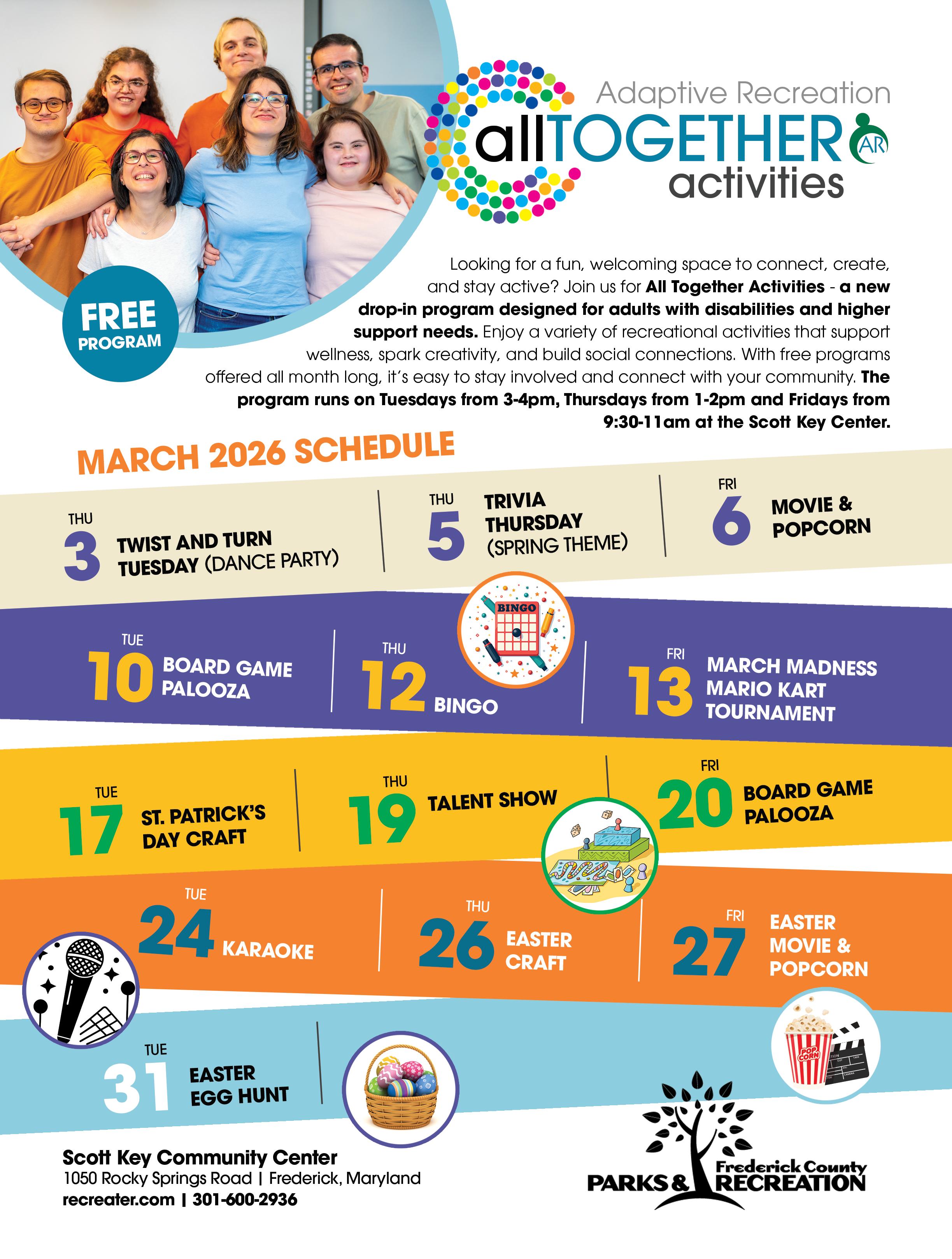 Frederick County Parks and Recreation offers Adaptive Recreation (AR) programs designed to meet the needs of individuals with disabilities, developmental differences, and/or higher support needs as well as emphasize participants’ unique abilities. Programs utilize trained staff and higher staff/participant ratios in addition to adapted spaces, materials, and content to provide an opportunity for individuals to participate in various recreation activities.