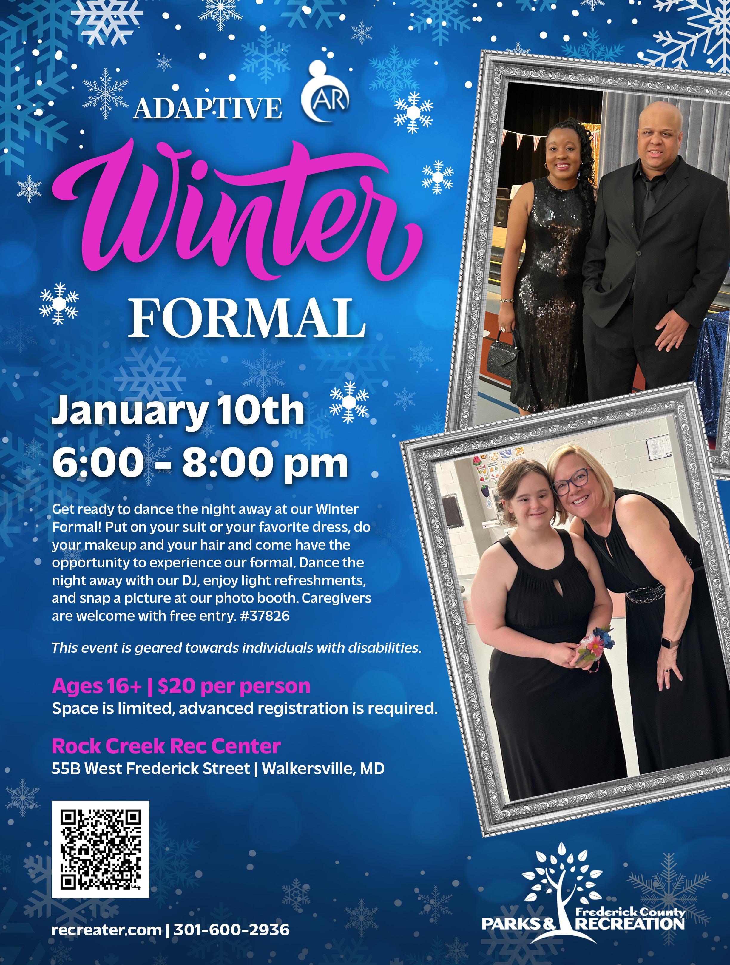 Essential Eligibility Criteria: Program Level 1-4. Get ready to dance the night away at our Winter Formal! Put on your suit or your favorite dress, do your makeup and your hair and come have the opportunity to experience our formal, dance the night away with our DJ, enjoy light refreshments, and snap a picture at our photo booth. Caregivers are welcome with free entry. We ask that due to space, you limit to only one additional person per participant. This event is geared towards individuals with disabilities. Advanced registration is required. Limited space is available, so we recommend that you sign up early. If participant needs assistance with personal care, a caregiver must remain onsite. Goal: To increase socialization and increase community engagement.