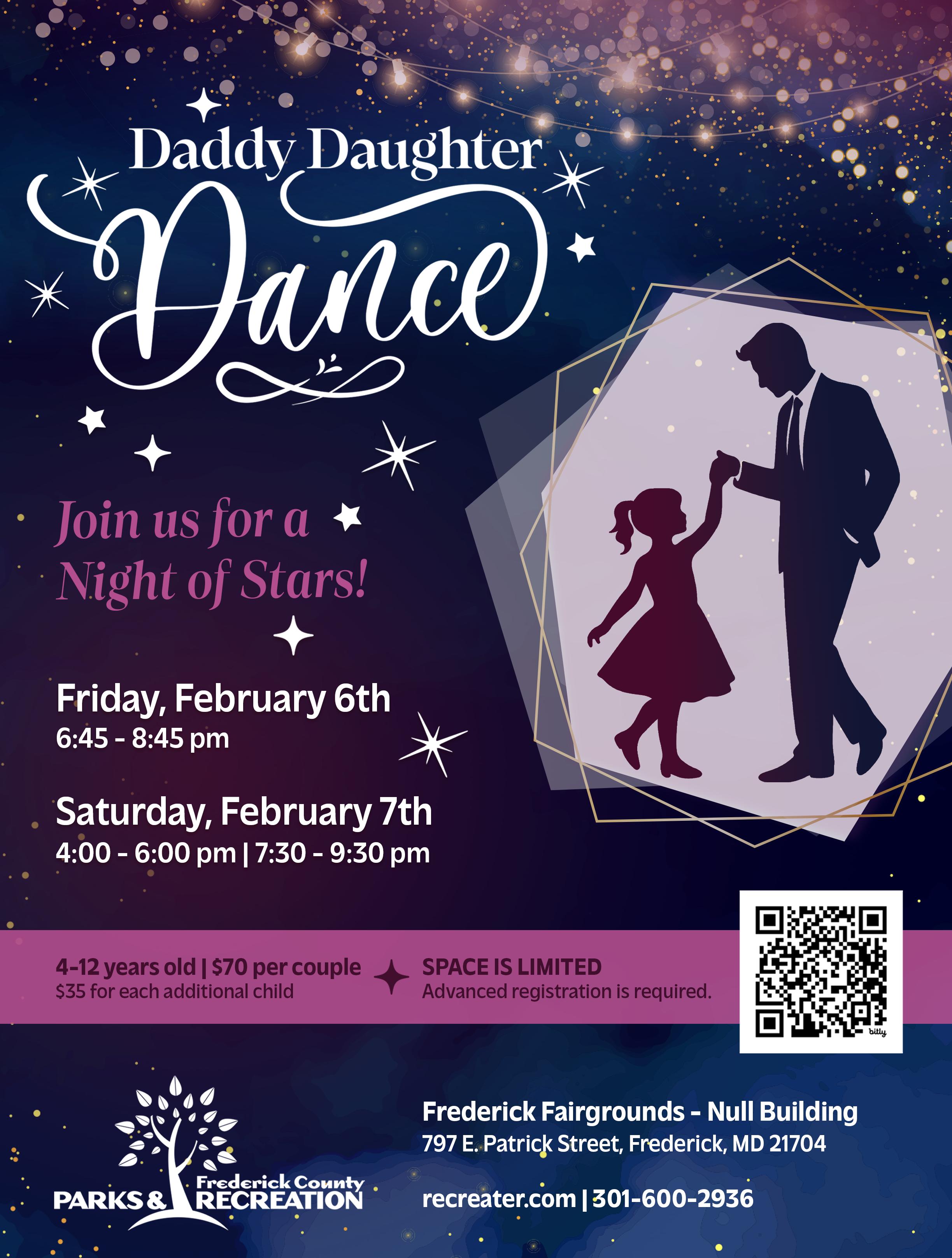 Step into a sparkling evening under the stars! Treat your starlet to a night she will never forget full of music, dancing, and magical memories. Dress to impress and shine together on the dance floor. Light refreshments will be served. An adult male must accompany his star(s). Advanced registration is required. Space is limited, please register early to reserve your spot! $35 for each additional child. Program #38091 (February 6th | 6:45-8:45pm), #38092 (February 7th | 4:00-6:00pm), #38093 (February 7th | 7:30-9:30pm)
