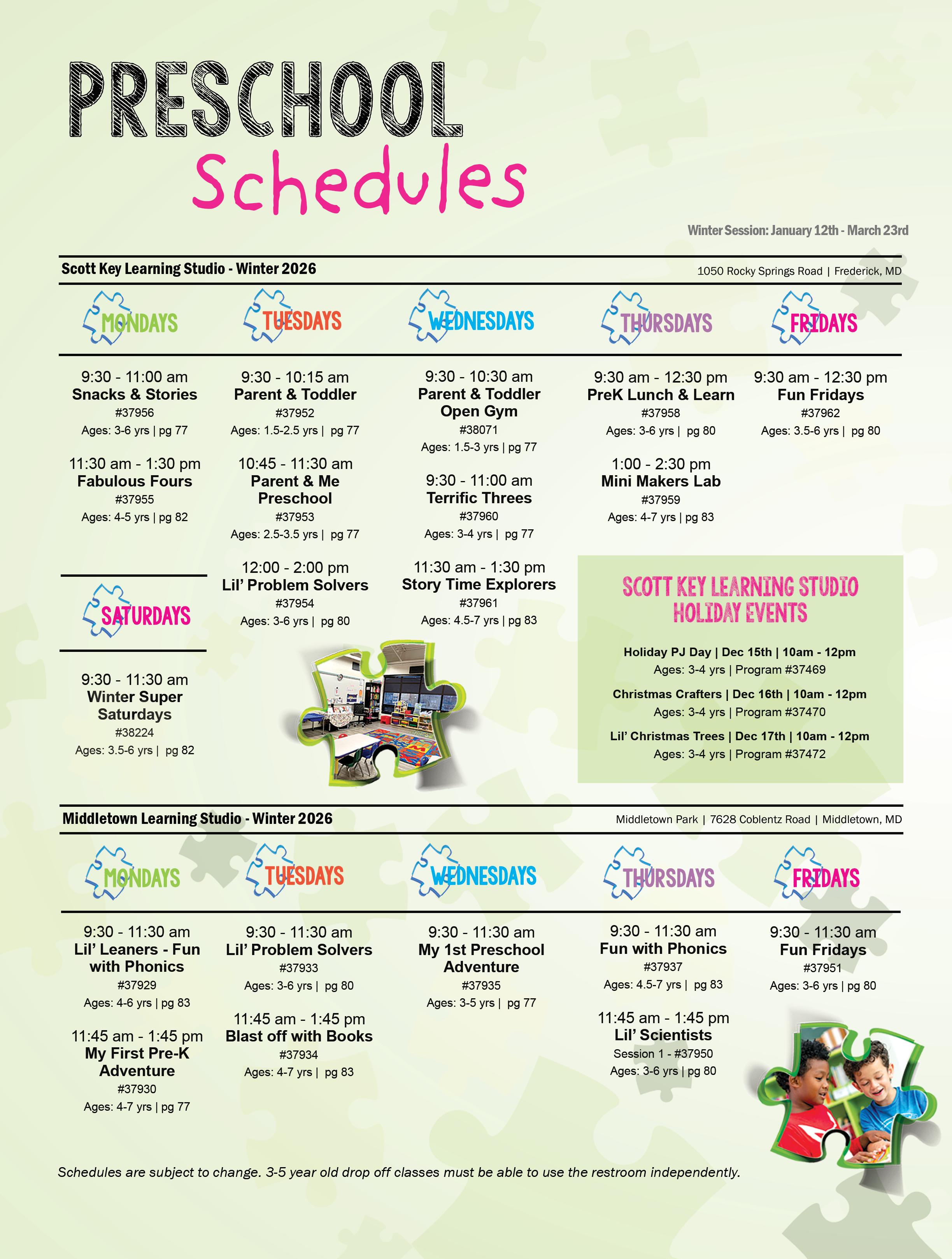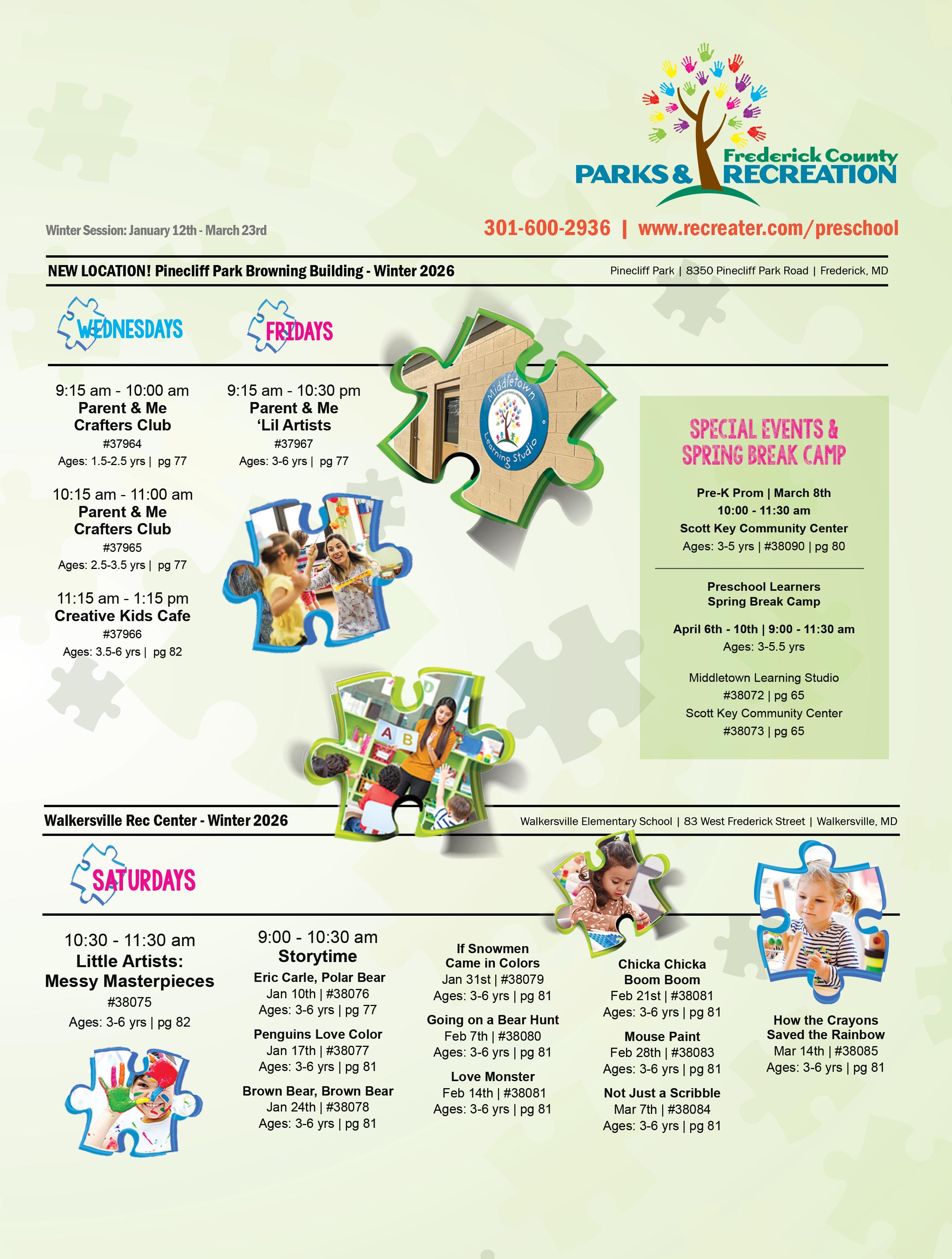 To check for weather related cancellations on social media, go to: Facebook.com/FrederickParksandRec or Instagram.com/FrederickParksandRec