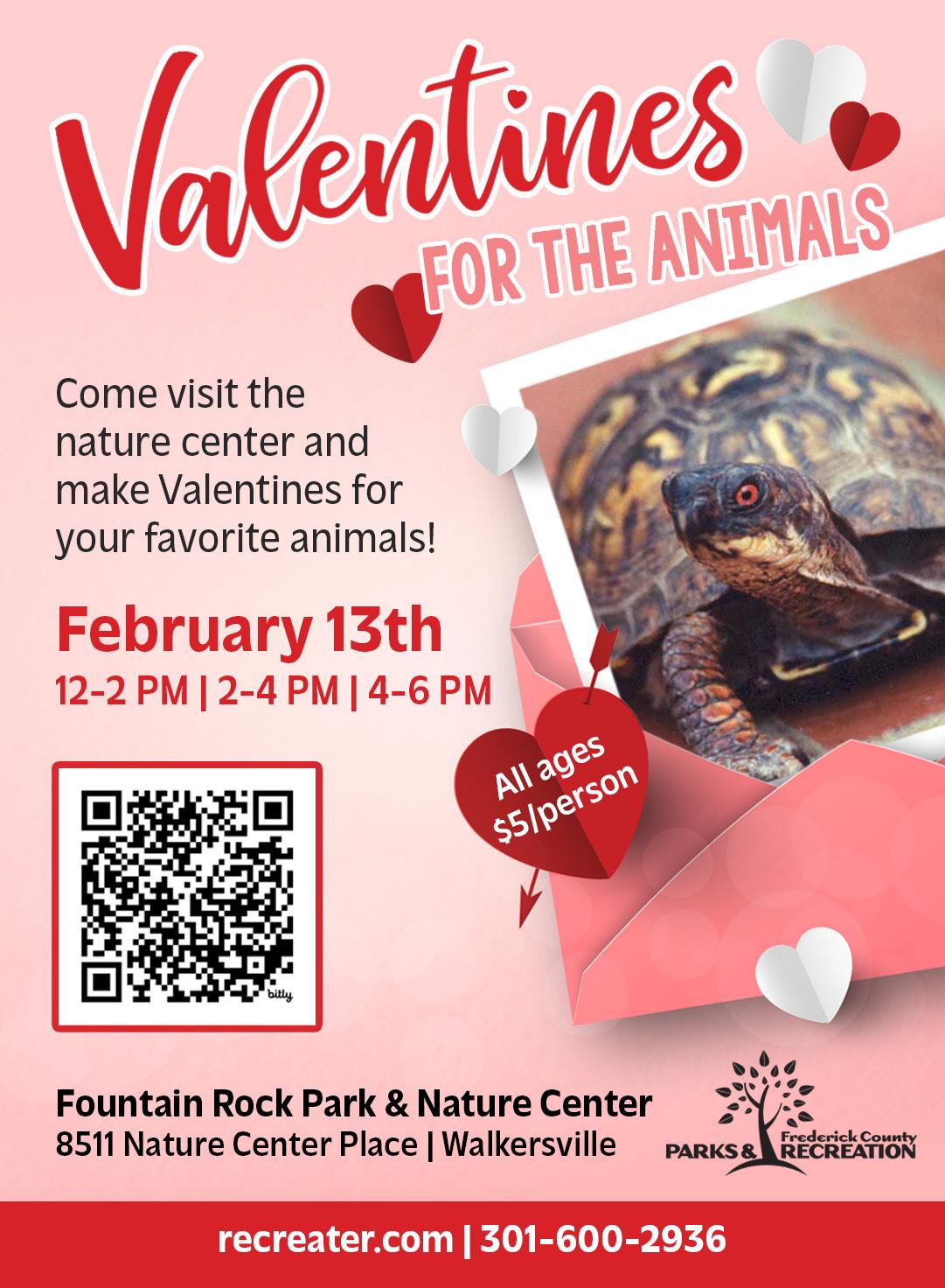 Celebrate Saint Valentine’s Day and show your love for our Animal Ambassadors that live at the park. Families can visit the Nature Center and make a Valentine’s Day card for their favorite animals! All supplies provided. Price is per child, please register in advance. Program #36303 (12:00-2:00pm), #36304 (2:00-4:00pm), #36305 (4:00-6:00pm)