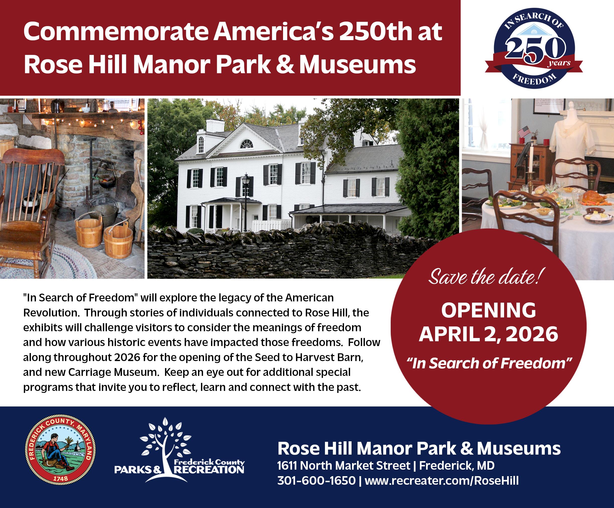 Step back in time and commemorate 250 years since the American Revolution at Rose Hill Manor Park & Museums. Through a series of new exhibits and experiences, discover the complex ideas of freedom that shaped our nation and the lives of those who lived at Rose Hill. The In Search of Freedom exhibit opens April 2, 2026, inviting visitors to reflect on the pursuit of liberty and the legacy of slavery during the Revolution and throughout the rest of American history, all told through the stories of the inhabitants of Rose Hill and Frederick County. Join us throughout the year as the Seed to Harvest Barn opens in Summer 2026 and the new Carriage Museum debuts in Fall 2026—each offering unique ways to explore and reflect on the past. Stay tuned for more programs and events throughout 2026 as we honor this milestone with opportunities to learn, remember, and connect with history in meaningful ways.