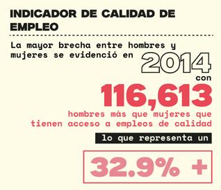 Pese a lo anterior, las mujeres aún enfrentan una menor participación en comparación con los hombres. Esto se refleja en el acceso al Indicador de Calidad de Empleo, donde se observa que hay más hombres que tienen empleos de calidad en comparación con las mujeres. La mayor brecha entre hombres y mujeres se evidenció en 2014, con 116,613 hombres más que mujeres que tienen acceso a empleos de calidad, lo que representa un 32.9% más (Caceres & Achinelli, 2020).