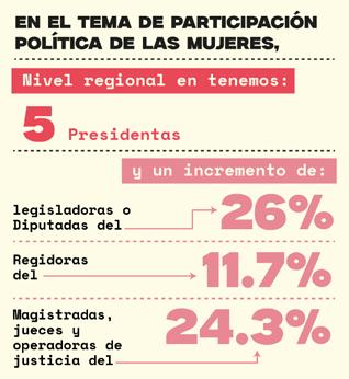 Derechos de las Mujeres y la Igualdad de Género en la región, en la Conferencia Regional sobre la Mujer de América Latina y el Caribe, así como los datos que la CEPAL, el tema de la participación política de las mujeres sigue siendo relevante ya que a nivel regional en tenemos 5 presidentas, hay un incremento de legisladoras o diputadas de un 26% (o sea que estamos a la mitad de la cuota), así mismo las regidoras (11.7%) y en magistradas, jueces y operadores de justicia (24.3%). Estos datos nos informan que, partiendo del principio de paridad, debemos continuar el la búsqueda de la participación de las mujeres, garantizando el 50% de participación activa de las mujeres en la toma de decisiones políticas, sociales en los países en Latinoamérica, mientras se utilizan las estadísticas de género, esenciales para comprender las desigualdades y diseñar políticas públicas que promuevan la igualdad entre hombres y mujeres. En consecuencia, los sistemas de información de la CEPAL, como CEPLSTAT y REDDATAM, nos proporcionan la realidad de la participación política de las mujeres, así como la igualdad de género y sostenibilidad, junto con datos sobre los avances que la Alianza Regional para la Digitalización de las Mujeres en América Latina y el Caribe.