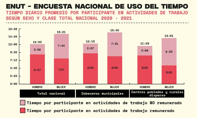 En la zona rural, la situación es aún más alarmante. La brecha de género en la participación del trabajo del cuidado es de 5 horas 33 minutos. Las mujeres del campo dedican 8 horas 33 minutos a estas actividades, casi 3 veces el tiempo que dedican los hombres.
