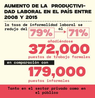 Esta disminución en el empleo informal ha sido acompañada por un incremento notable en el número de puestos de trabajo formales, lo que ha contribuido al aumento de la productividad laboral en el país. Entre 2008 y 2015, la tasa de informalidad laboral se redujo del 79% al 71%, añadiéndose 372,000 puestos de trabajo formales en comparación con 179,000 informales (en términos netos). Tanto el sector privado como el público han contribuido a este incremento, siendo las grandes empresas formales las principales generadoras de empleo en el sector privado (DGEEC, 2017).