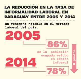 La reducción significativa en la tasa de informalidad laboral en Paraguay entre 2005 y 2014 ha sido un fenómeno notable en el mercado laboral del país. En 2005, el 86% de la población ocupada estaba en empleo informal, mientras que en 2014 esta cifra disminuyó al 78%, lo que representa una reducción de alrededor de 8 puntos porcentuales en una década (Caceres & Achinelli, 2020). Es importante destacar que, a pesar de esta reducción, una gran proporción de asalariados privados y prácticamente todos los trabajadores por cuenta propia permanecen en empleo informal.