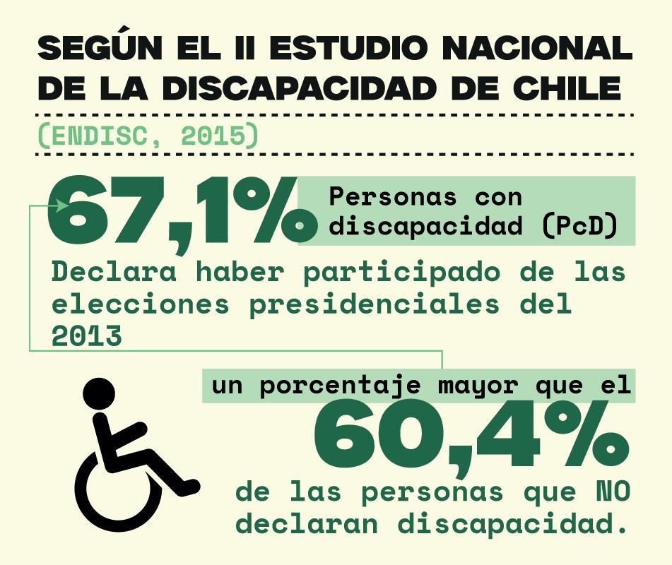 La Convención Internacional sobre los Derechos de las Personas con Discapacidad (CDPD) garantiza los derechos políticos y la posibilidad de gozar de ellos en igualdad de condiciones a las personas sin discapacidad (Art.29). Lo anterior implica asegurar la participación plena y efectiva de las personas con discapacidad (PcD) en diversas instancias asociadas a la participación política, entre ellas en el derecho a voto. Para asegurar este derecho, se debe resguardar que los procedimientos, instalaciones y materiales electorales sean adecuados y accesibles, por ejemplo, permitir que las PcD puedan elegir una persona de su elección que les preste asistencia para votar (SERVEL, s/a). Según el II Estudio Nacional de la Discapacidad de Chile (ENDISC, 2015), el 67,1% de las PcD que respondieron la encuesta declara haber participado de las elecciones presidenciales del 2013, un porcentaje mayor que el 60,4% de las personas que no declaran discapacidad.
