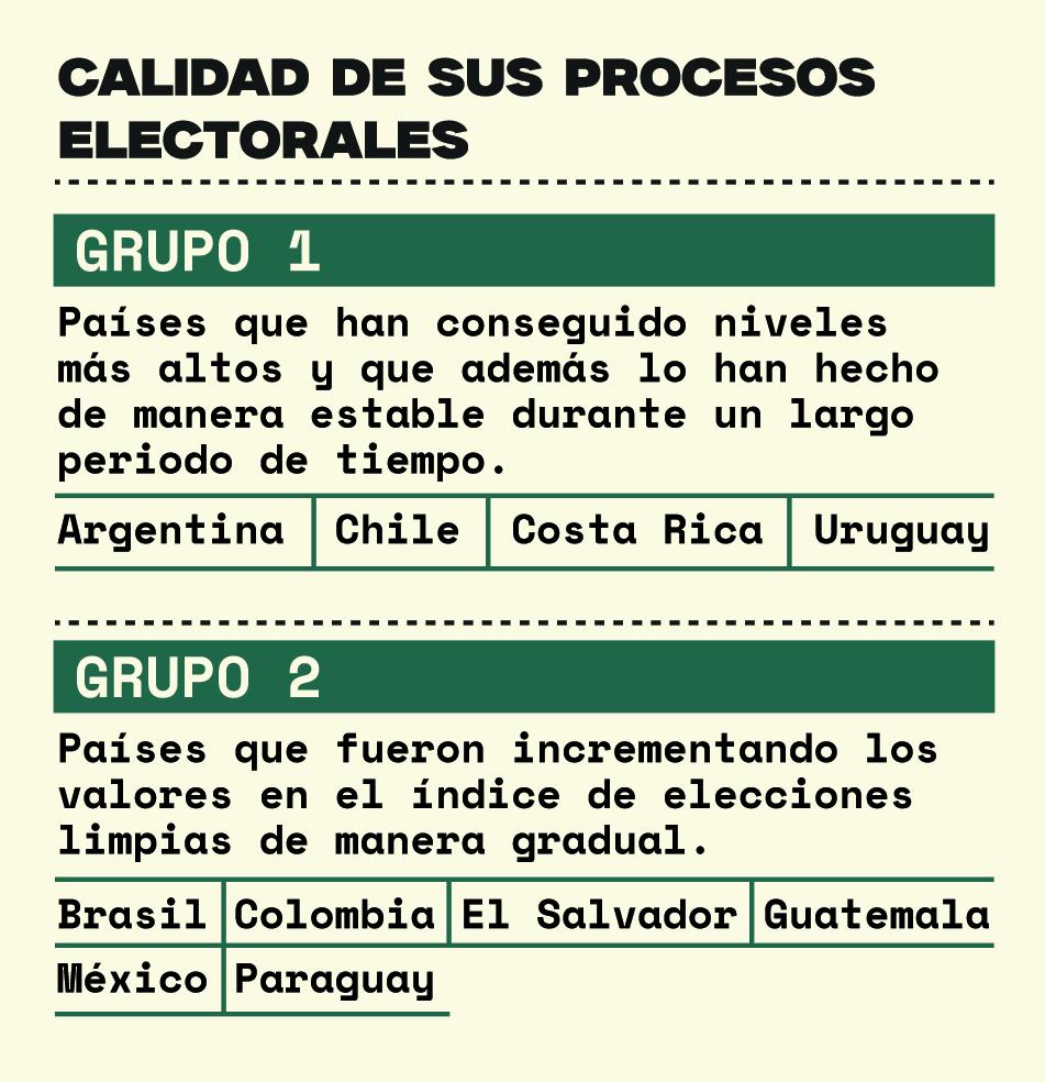 En esta evaluación global se evidencia que no todos los países de América Latina cuentan con el mismo nivel de calidad de sus procesos electorales. Los países se pueden agrupar en cuatro grupos. En el primer grupo se encuentran aquellos países que han conseguido niveles más altos y que además lo han hecho de manera estable durante un largo periodo de tiempo (Argentina, Chile, Costa Rica y Uruguay). Tanto Costa Rica como Uruguay son los que aparecen con valores medios por encima de 0.9 puntos porcentuales, los más cercanos al valor más alto del Índice. En el segundo grupo están los países que fueron incrementando los valores en el Índice de Elecciones Limpias de manera gradual con el transcurso del tiempo y que han enfrentado varias situaciones conflictivas respecto a la gobernanza electoral (Brasil,