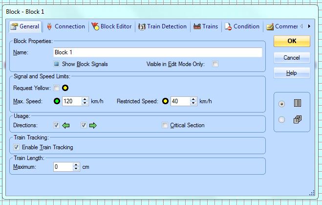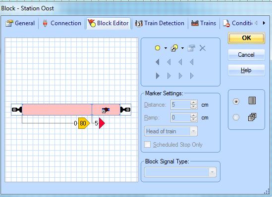 Als laatste moeten we nog de lengtes van het blok en het stopstuk ingeven. Dit is essentieel, omdat door de lengtes in te geven de locomotief “weet”, wanneer hij moet gaan afremmen en uiteindelijk stoppen. We werken in dit railplan met een gemiddelde bloklengte van 1 meter, waarin dan ook nog een stopstuk van 20 cm zit. De verdeling wordt dan 80/20 per blok. We selecteren allereerst het blok, daarna het gele pijltje naar links , het volgende beeld verschijnt: