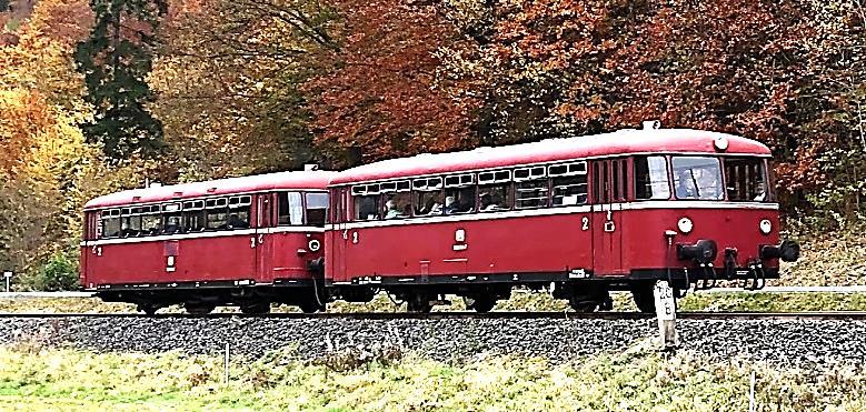 Op maandag 28 oktober vertrekken wij met onze bagage uit het hotel in Bayreuth om alweer met een bus naar Steinweisen te gaan. De reden voor het veelvuldig in een bus vertoeven, heeft te maken met het gegeven dat de Deutsche Bahn net in deze periode overal en nergens met het spoor doende is. Op het station van Steinweisen stappen wij in een Schienenbusgarnitur uit het jaar 1959. Dat wil zeggen een motor- en een stuurstandwagen (VT 798 en VS 998) van de beroemde ‘Roten Brummer’.