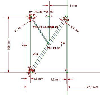 In de bovenstaande tekening (links) zie je hoe in het platte vlak het ontwerp is gemaakt. In het rechter plaatje zie je hoe dat er dan in 3D uitziet. Als je goed oplet, zie je dat het linker plaatje maar de helft is. Door de tekening te spiegelen, ontstaat dan het complete frame.