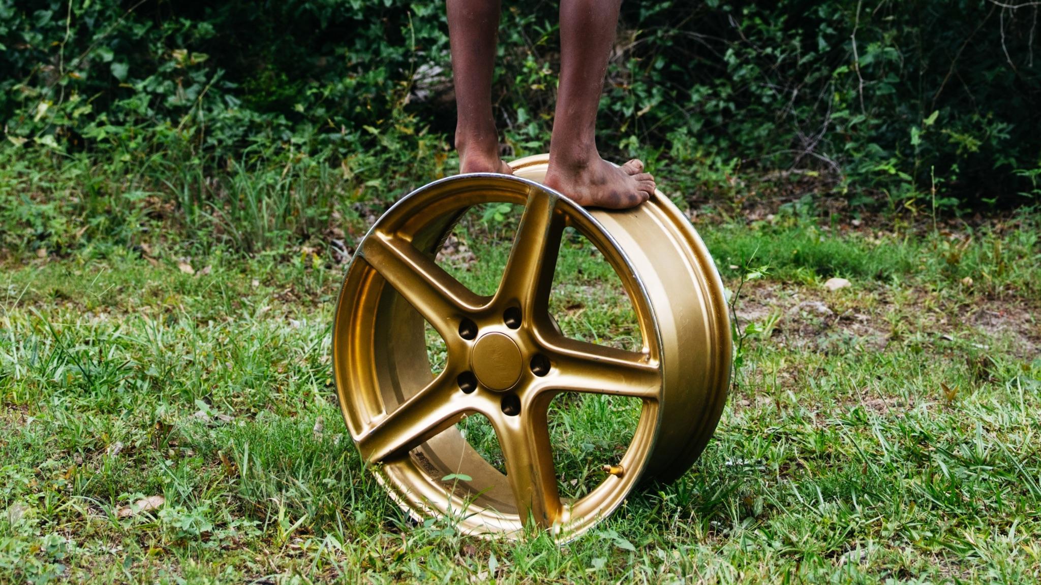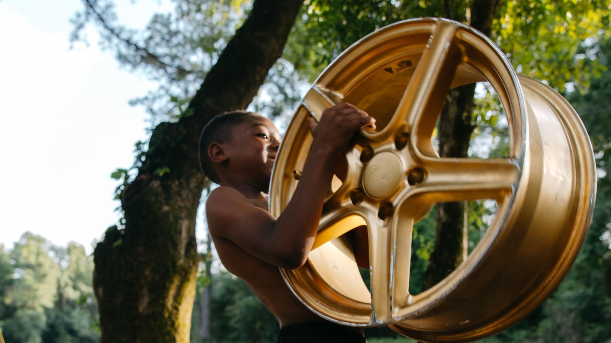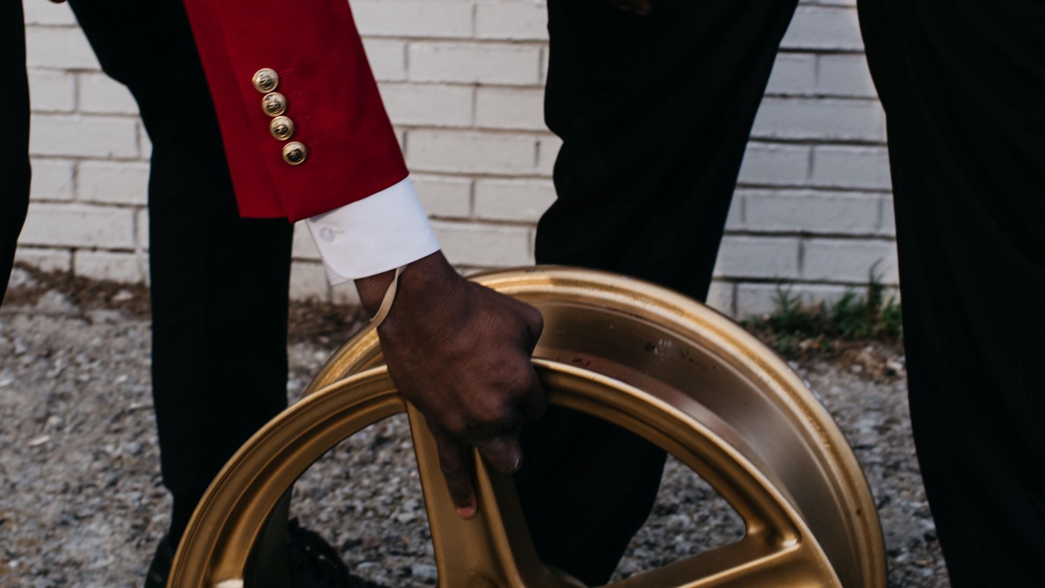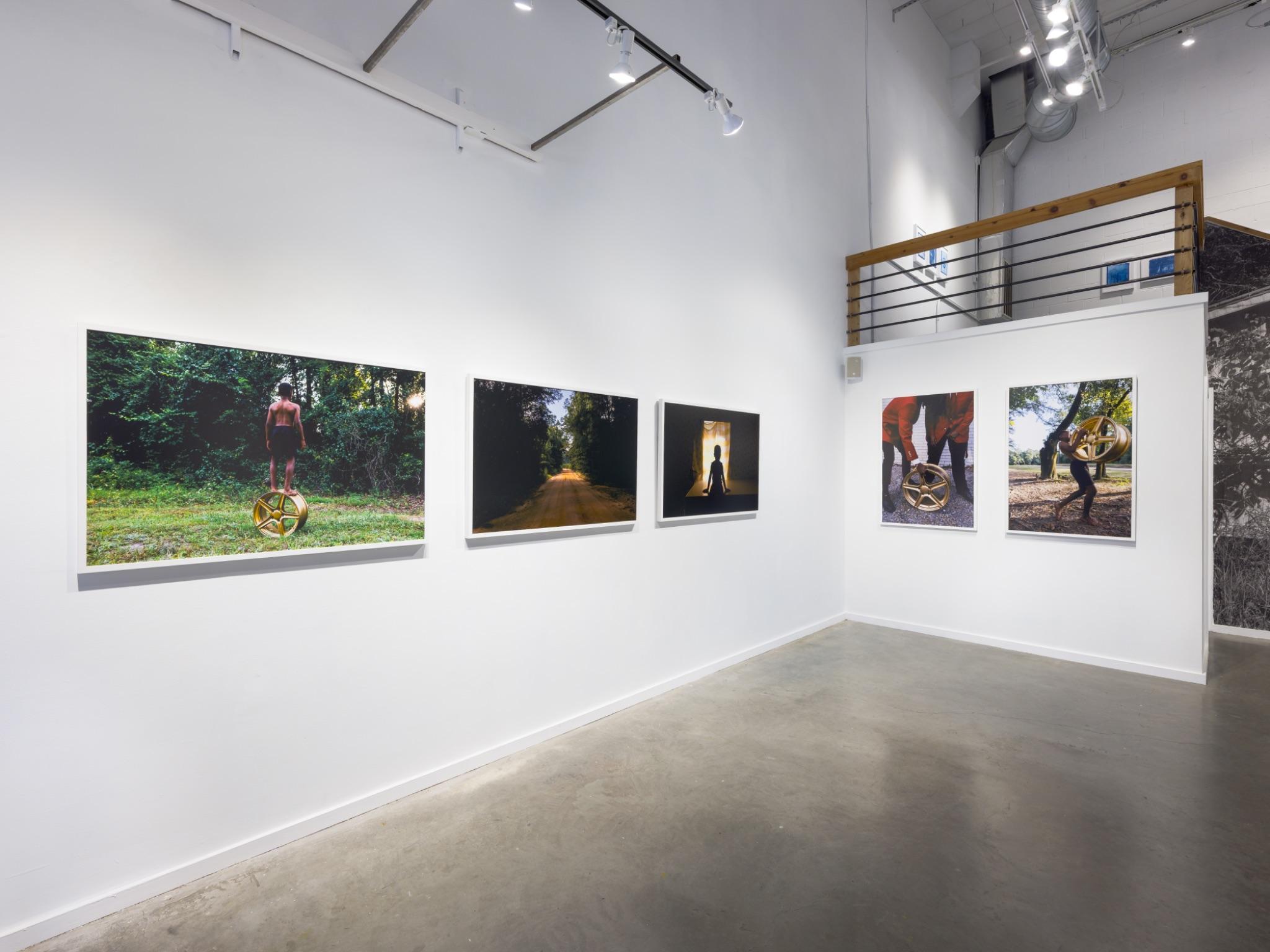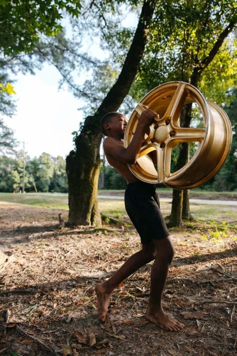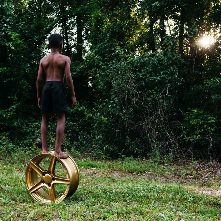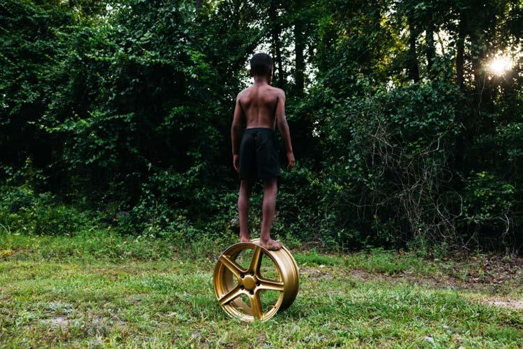 “In the series’ leading image, a young man stands tall and centered, shirtless atop a gold rim in a field of grass. Before him, the sunset filters through the trees, bathing the scene in a quiet, golden light. The moment is one of balance and poise, both intimate and monumental. The gold rim beneath his feet is not merely an object—it becomes a cypher, a rhythmic, lyrical symbol of continuity. Within this circular form lies the essence of cultural inheritance: the passing down of oral histories, traditional practices, and creative energy through generations.