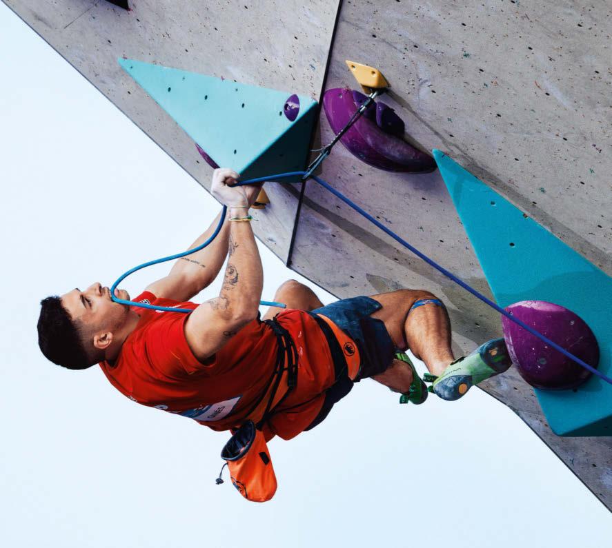 Two years earlier, in the summer of 2021, López had achieved his life goal at 18 – winning gold in the world’s frst men’s Olympic sports climbing event. To say he was an underdog would be an understatement. Despite topping the speed climbing, he came last in the bouldering. With the lead climbing category still to come, he faced the best in the world – Adam Ondra.