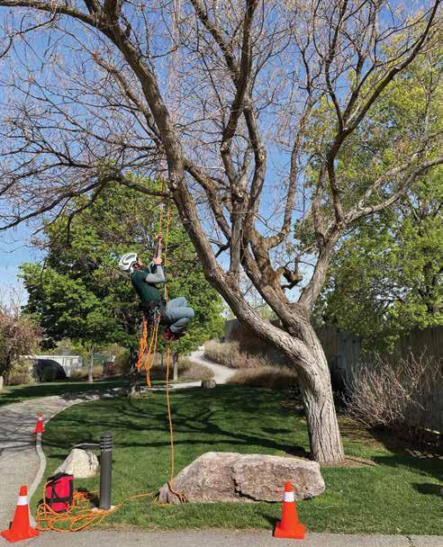 Arborist Charlie Perington ascends Styphnolobium japonicum (known commonly as Japanese pagoda tree or Chinese scholar tree) to perform reduction pruning on the lowest first order branch.