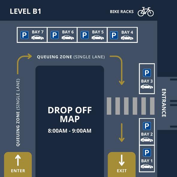 The carpark entrance door will be open during this time. Please follow signs to pull into the designated drop-off bays where your child can exit safely