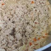 Se pica el atún en cuadritos, se pica finamente la cebolla roja y el cilantro y se mezcla con el atún.