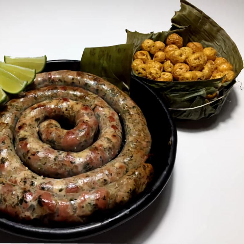 En una sartén caliente con aceite de achiote, se agregan las verduras cortadas en cubos pequeños y el comino. Cuando se obtenga un sofrito costeño, se agrega la carne molida revolviendo constantemente. Luego se deja enfriar para evitar que el relleno genere cámaras de aire al momento del armado. Se forman bolitas de masa de 70 gramos aproximadamente, se dejan huecas en el centro y se agrega la carne como relleno, luego se cierran en forma de punta. Se llevan a fritura profundaa140°C.