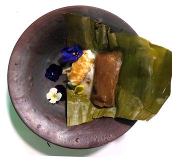 Se realiza una mayonesa con los huevos criollos, vinagre de plátano, aceite de ajonjolí, pasta de ajonjolí, camu camu y catara. Se monta el ceviche sobre la mayonesa, se realiza un crocante de batata y se adicionaconajíojodepezypolvodeajonegro.