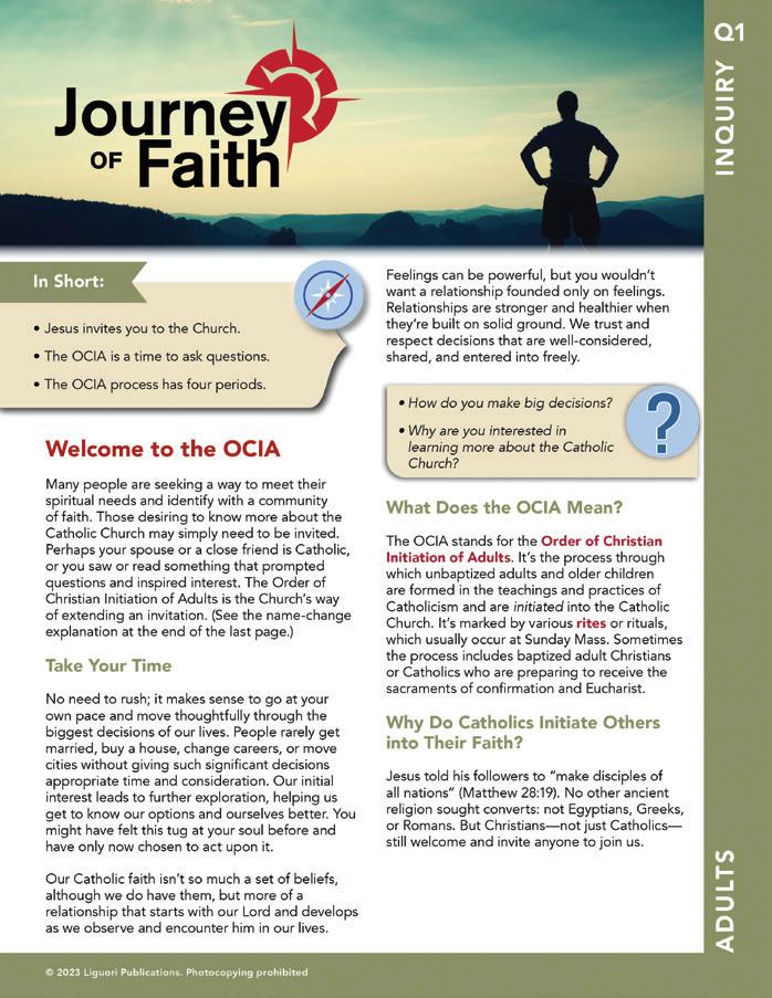 The Journey of Faith 48-lesson program can be ordered as a complete set for each audience, or as a separate packet for each of the four stages — Inquiry, Catechumenate, Enlightenment, and Mystagogy. Each packet contains lessons that are nested together, making it easy to pull the right paper for each week’s lesson.