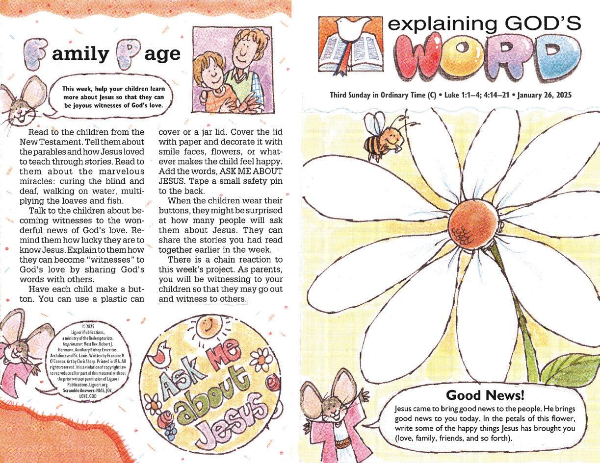 This children’s bulletin is a simple way to begin to engage little ones with the Gospel, using coloring, games, and other activities to teach preschool through second grade children about the weekly readings. These colorful handouts are printed on both sides and are available in multiples of 50 (minimum order).
