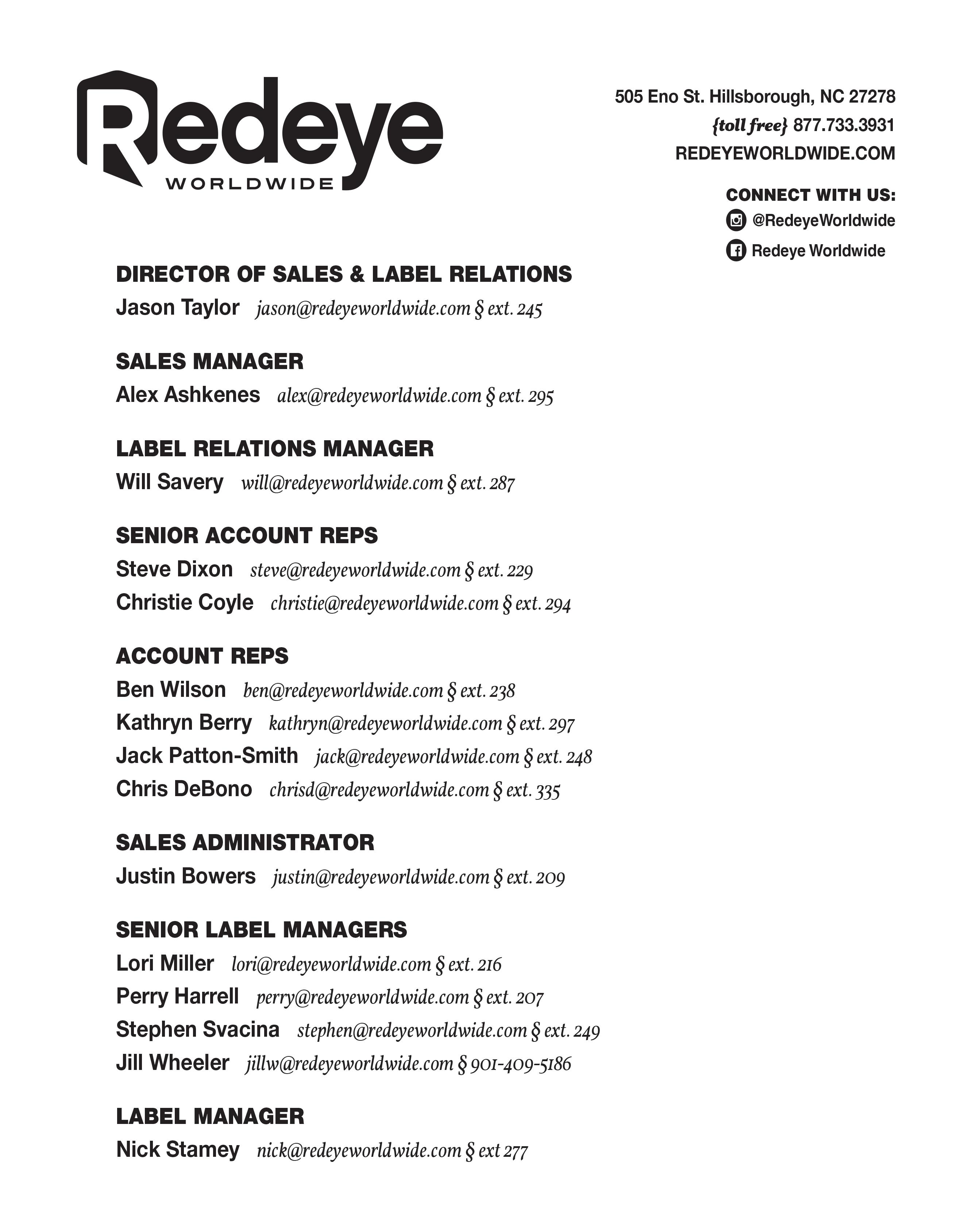 Redeye Distribution 505 Eno Street Hillsborough, NC 27278 United States abelsm@redeyeworldwide.com