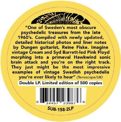 2LP vinyl LP housed in a day-glo psychedelic cover. With printed inner sleeves and updated liner notesandphotos Limitededitionof 500copies. “OneofSweden’smost obscure psychedelic treasures from the late 1960’s. Compiled with newly updated, detailed, historical photos and liner notes by Dungen guitarist, Reine Fiske. Imagine vintage Cream and Syd Barrett-led PinkFloydmorphingintoaprimeval Hawkwind sonic brain attack and you’re on the right track. They just may be the most impressive examples of vintage Swedish psychedelia you’re ever likely to hear.”