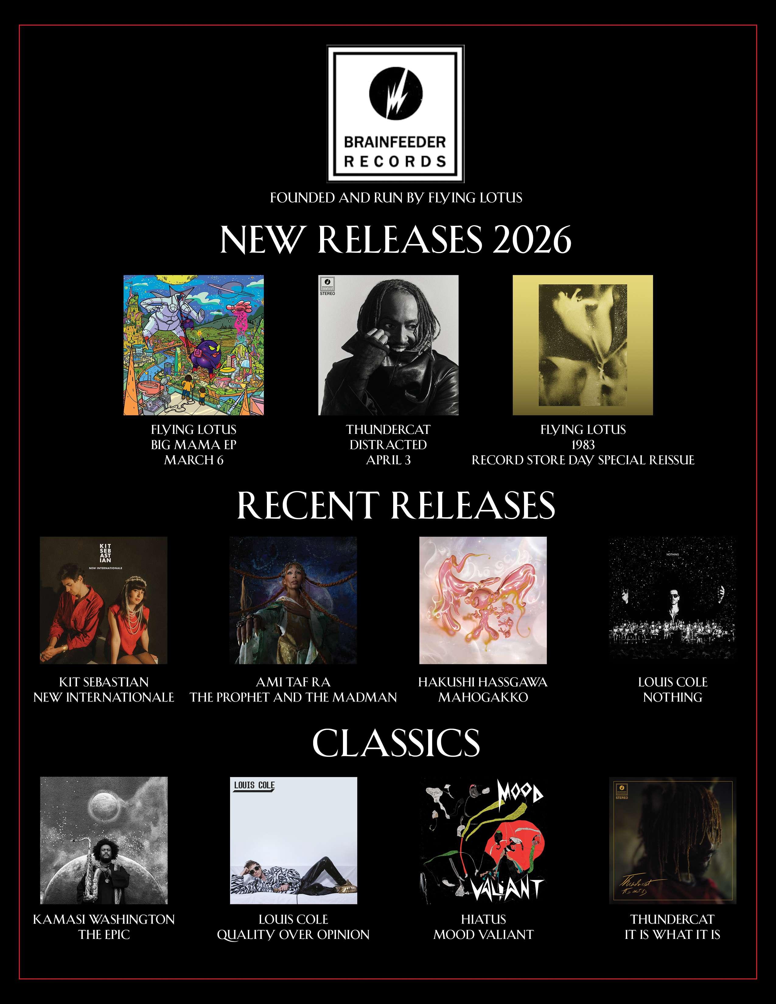Brainfeeder was founded by FlyLo in 2008 in Los Angeles, at a time when LA’s underground beat community was exploding. The label grew directly out of the city’s experimental electronic and hip-hop movement.