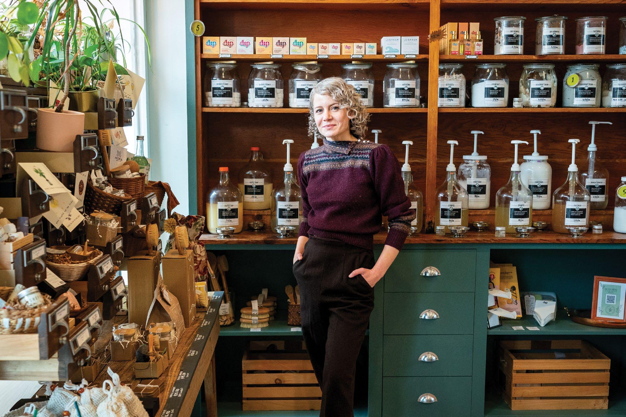 As a small-business owner, sustainability means more to Hirsch than recycling metals and eschewing plastic packaging. Her main focus is on creating a responsible, equitable workplace for herself and Tshatshke’s two employees.