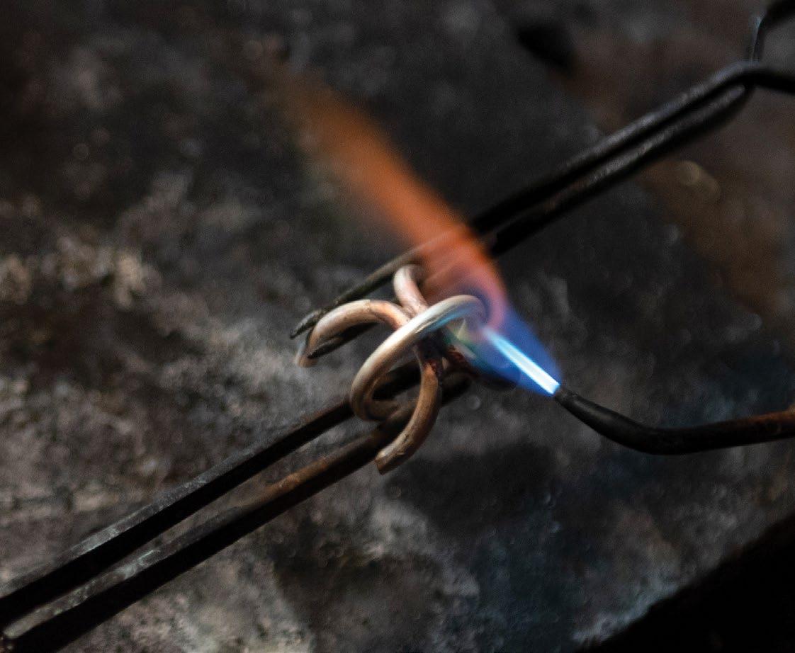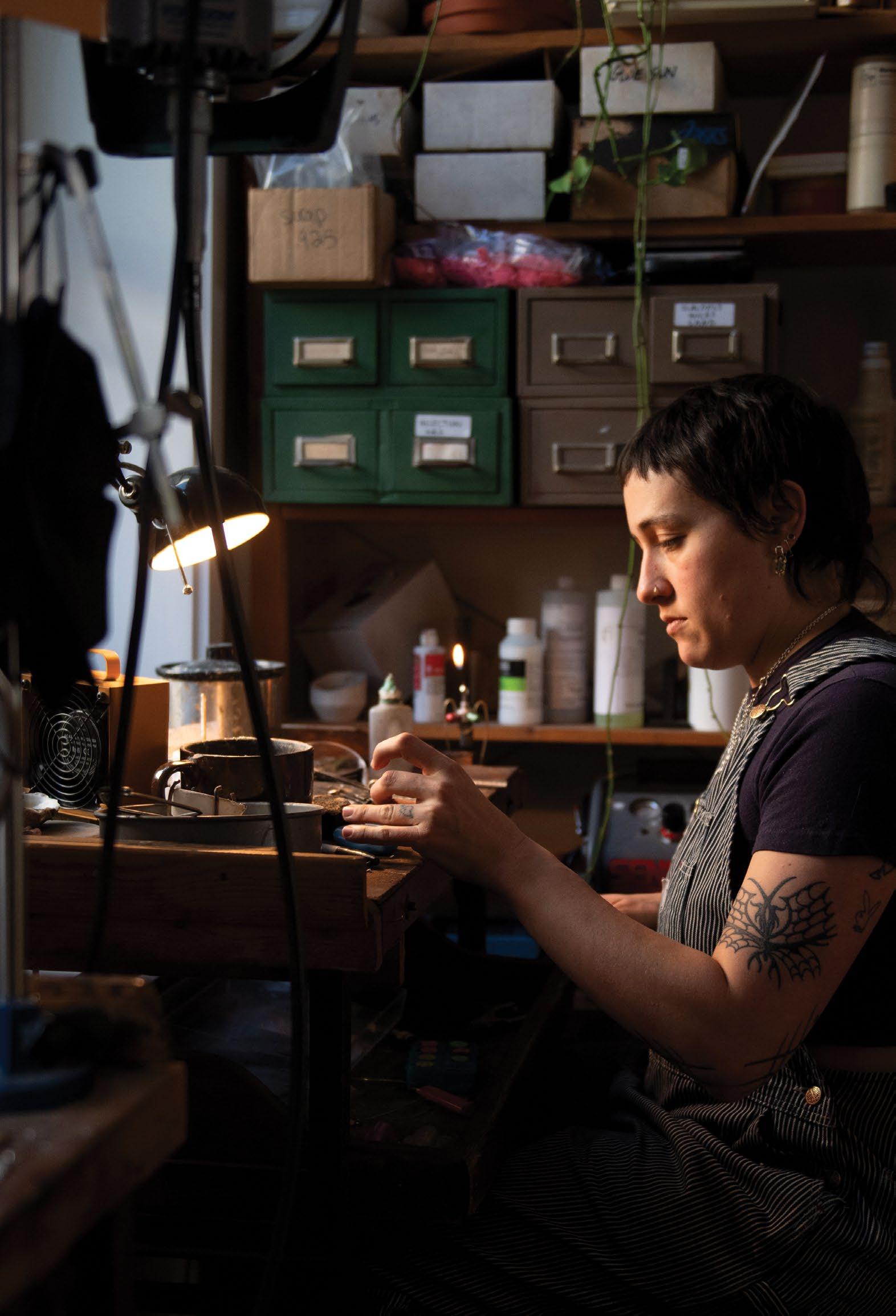 “I really love honing in on what someone wants and making something super unique,” she says. “Like right now, I’m working on a platinum engagement ring with three repurposed diamonds that echoes a matching tribal tattoo that the couple has.”