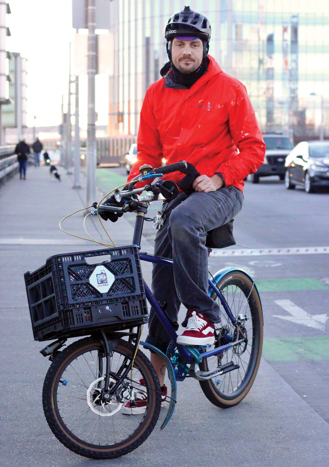 “I work at Neighborhood Bike Works. Bikes are a very large portion of my life. It’s pretty integral to my transportation, my mental health as well. It’s my outlet for doing something creative and active. This is my cargo bike. It’s an old mountain bike that I scored off eBay for super cheap. I put a Crust [brand cargo] fork on it and made it into my grocery-getter. I’ve got some errands to run after work, so I’ve been riding this thing, but it’s very slow and it’s a lot to push.”