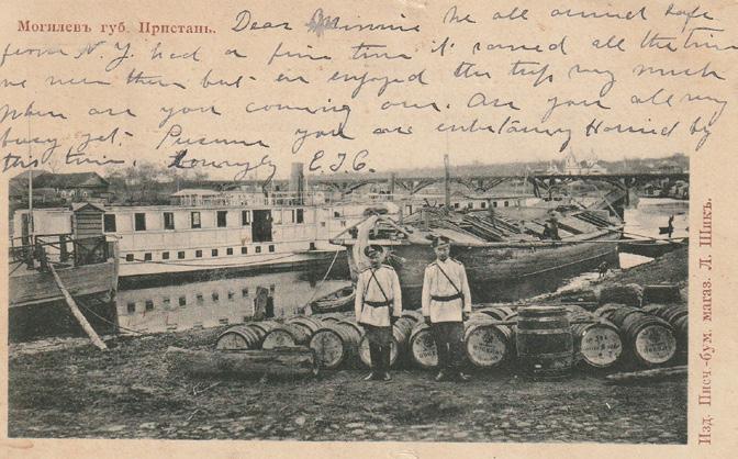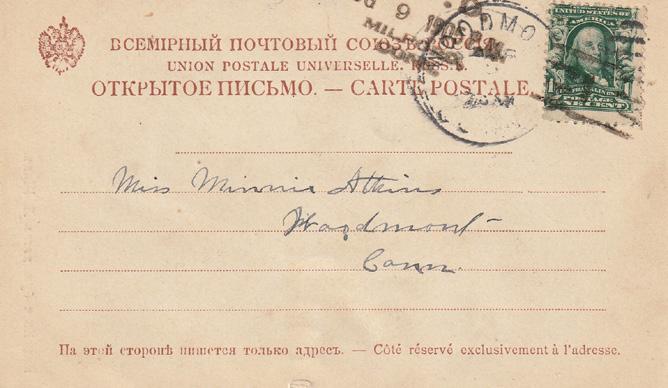 t was kind of a big deal for Miss Minnie Atkins when she received a postcard in the summer of 1905 all the way from the Mogilev province of Belarus! Of course, she had no idea what the Cyrillic type said, but still! How exciting to know someone who had travelled all the way to Russia. Those uniforms were so…exotic. It was enough to make Minnie’s little Woodmont world feel that much smaller. Still, it was sweet to be remembered. (Historical note: Minnie went on to marry Joseph Bishop Ells, lived to be 80, and is buried in Milford Cemetery.)