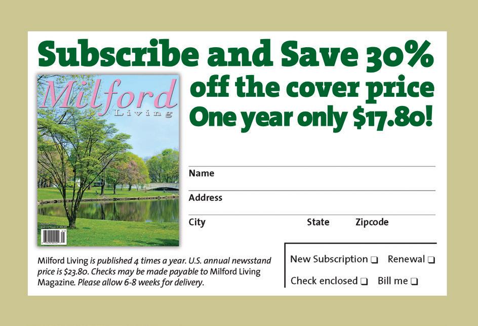 Milford Living Magazine (ISSN 1547-4429) is distributed quarterly by Red Mat Publishing. P.O. Box 2387 Milford, CT 06460. All rights reserved. No part of this publication may be reproduced without the express written permission of the Publisher. Subscription Rates: U.S. $23.96. Newsstand: $5.99. POSTMASTER: Send address changes to Milford Living Magazine P.O. Box 2387, Milford, CT 06460. Please allow six to eight weeks for subscription processing. Copyright 2003-2025 Red Mat Publishing. www.milfordliving.com/subscribe