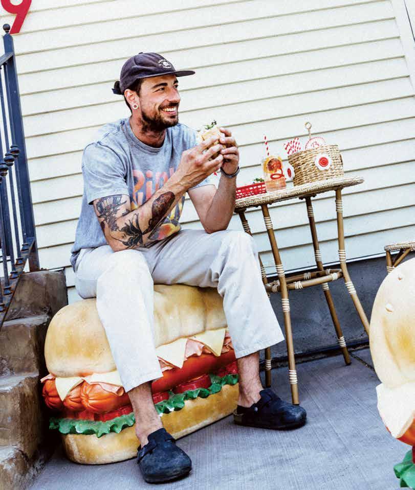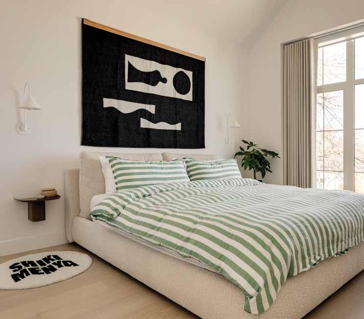 The home is peppered with nods to their restaurants, from the kitchen’s green metal stools from First Avenue Corner Store to the framed Shiki Menya posters hanging in the dining space. A particularly meaningful piece is the Shiki Menya rug a customer made and gifted to the couple for the restaurant’s 10th anniversary, which the couple put in their bedroom.