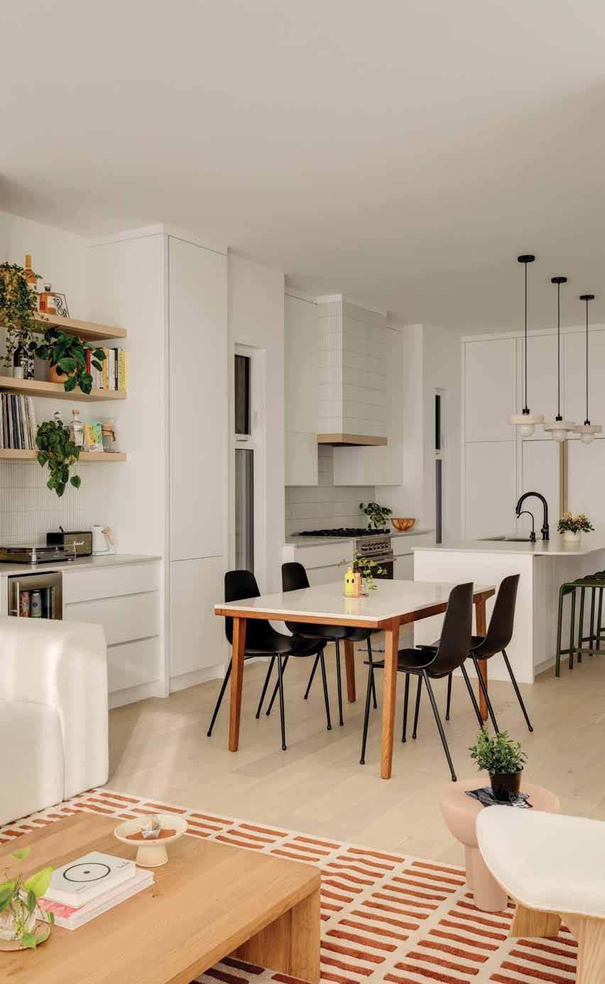 The kitchen embraces the home's neutral palette with white cabinetry, while incorporating unique elements like wood pulls on the fridge and a matching tiled backsplash and range hood.