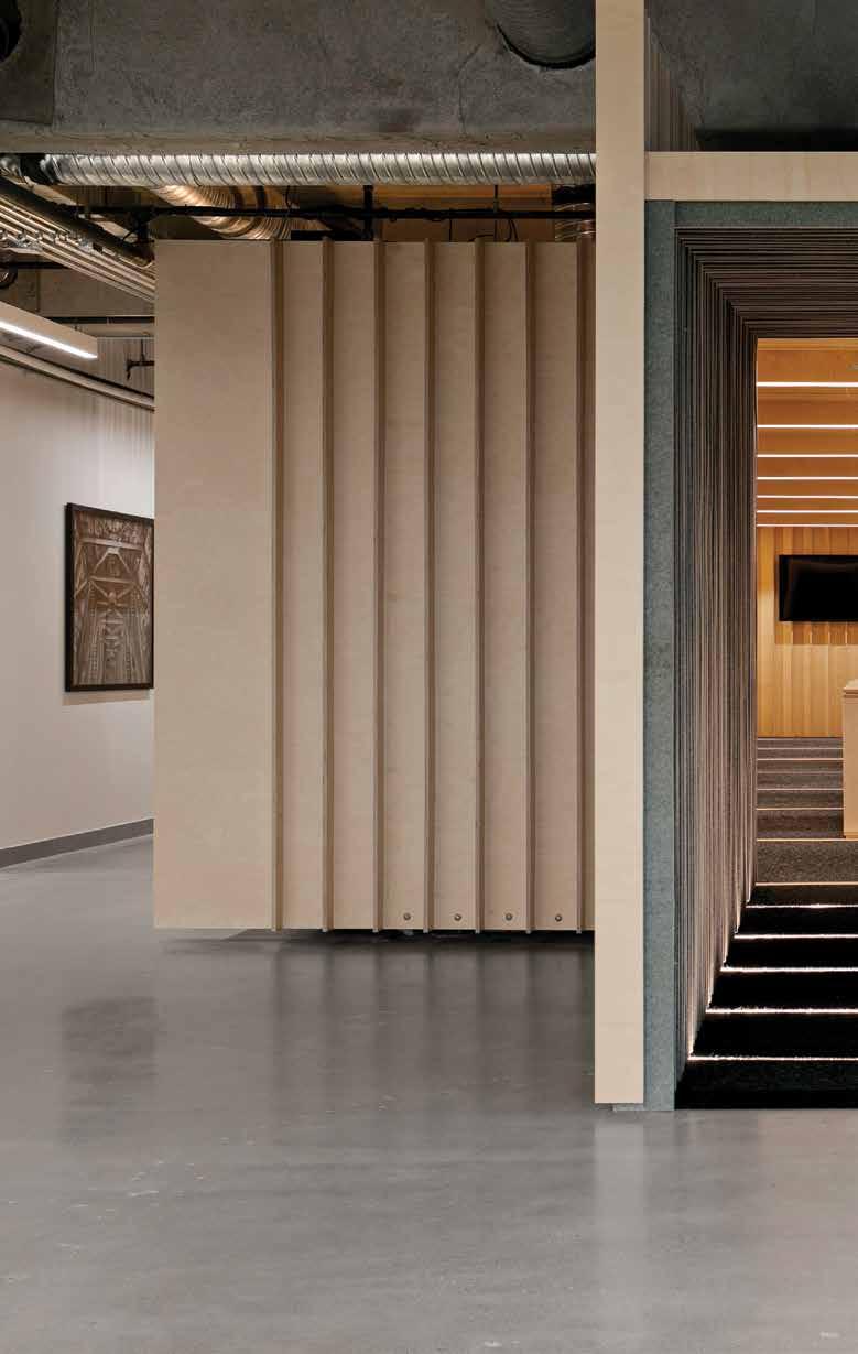 The entrance into the machine marks the transition between work and play, creating an energy shift as you pass through. It’s slightly narrow, with felt pieces to quiet any auditory disruptions. “We wanted it to feel very unconventional and maybe uncomfortable. The lighting strips in the floor shine up in your face as you're walking onto the trade floor,” says Kaun.