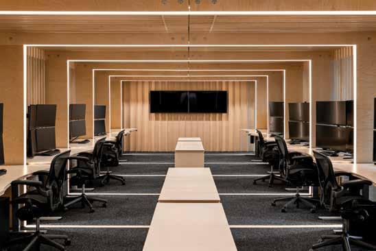 As you enter the machine through the portal, there’s a distinct change in pace from the casual spaces in the office. You walk up a slight ramp to the machine’s elevated platform. Inside, the work modules border the space with a central counter for optimal communication and collaboration. This clearly signals that the machine is where GBE’s traders get ’er done.