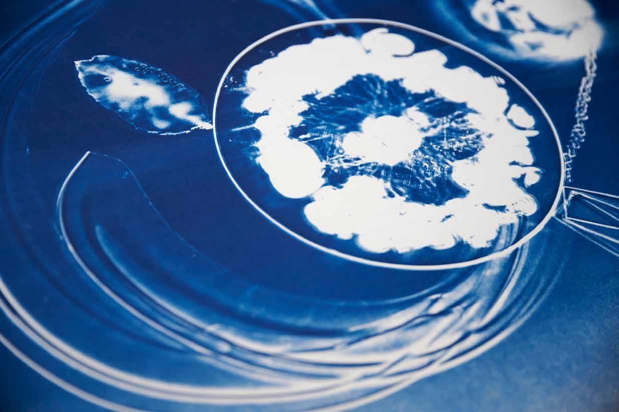 Leia Guo is an interdisciplinary artist and photographer who initially discovered cyanotype as a means to play with light and meld her passion for photography with glass blowing. A very early art form that influenced what photography is today, cyanotype was invented in the late 1800s. It is the process of capturing an image, typically by placing an object on chemically washed paper that is then exposed to sunlight. The resulting chemical reaction captures the outline of the image, usually against a Prussian blue background.