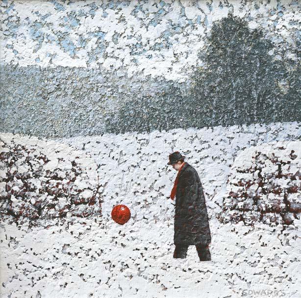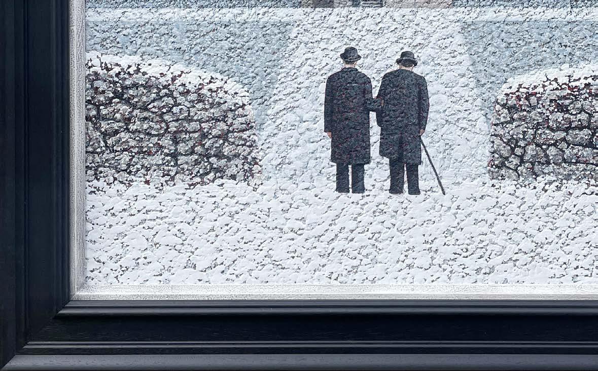 Additional clues are few. A single red balloon appears in several paintings - hanging from a branch, floating near the snowy ground, or in mid-air. In some, an abandoned overcoat is pegged to the stumpy limb of a tree. A steam train is often glimpsed travelling to an unknown destination. There are suggestions of fires here and there and sometimes the curious glow of a singlelit room. The alchemy of these incongruous components creates ambiguity and tension, inviting infinite interpretations.