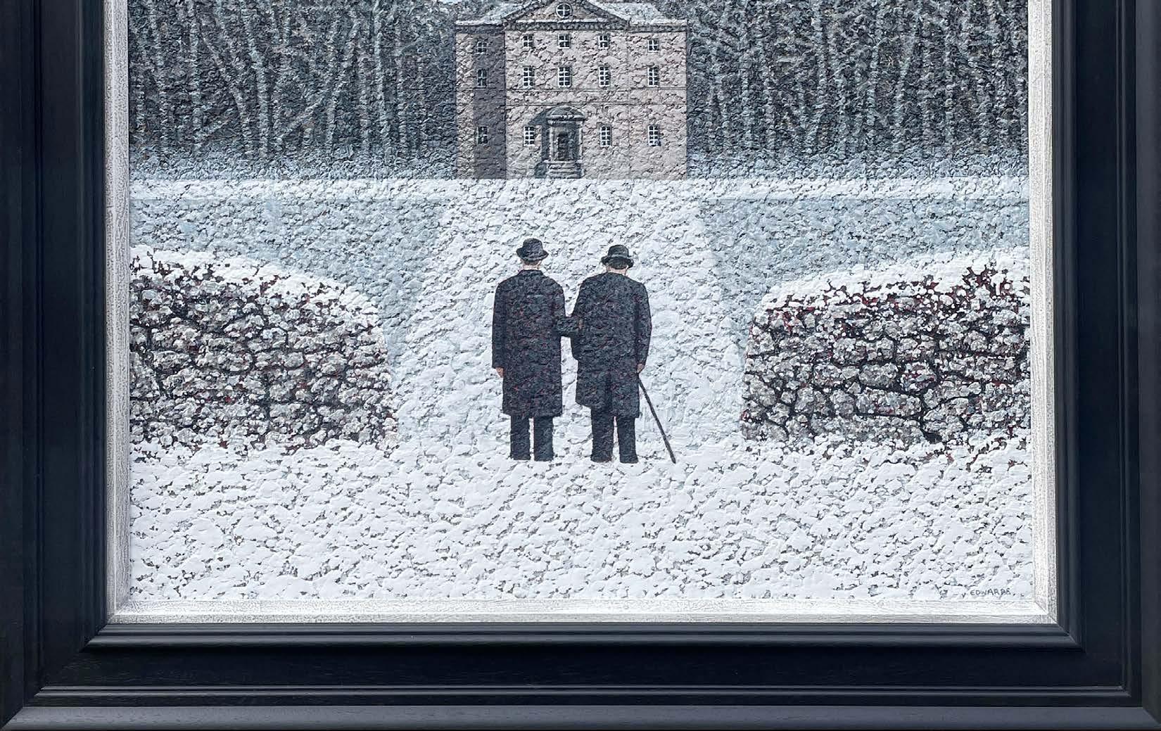 Once again, Edwards retains the strong visual narrative that makes ‘The White Wood’ so intriguing. Surrealist in style, it is forever winter, palpably cold, with snow on the ground. Most compositions are set around a wood of sharp, brutally cropped trees. Some also include isolated buildings, which the artist frequently returns to. The work is made compelling by the inclusion of anonymous men in dark overcoats and bowler hats, their feet sunk deep into the snow – a puzzling presence in the frozen landscape.