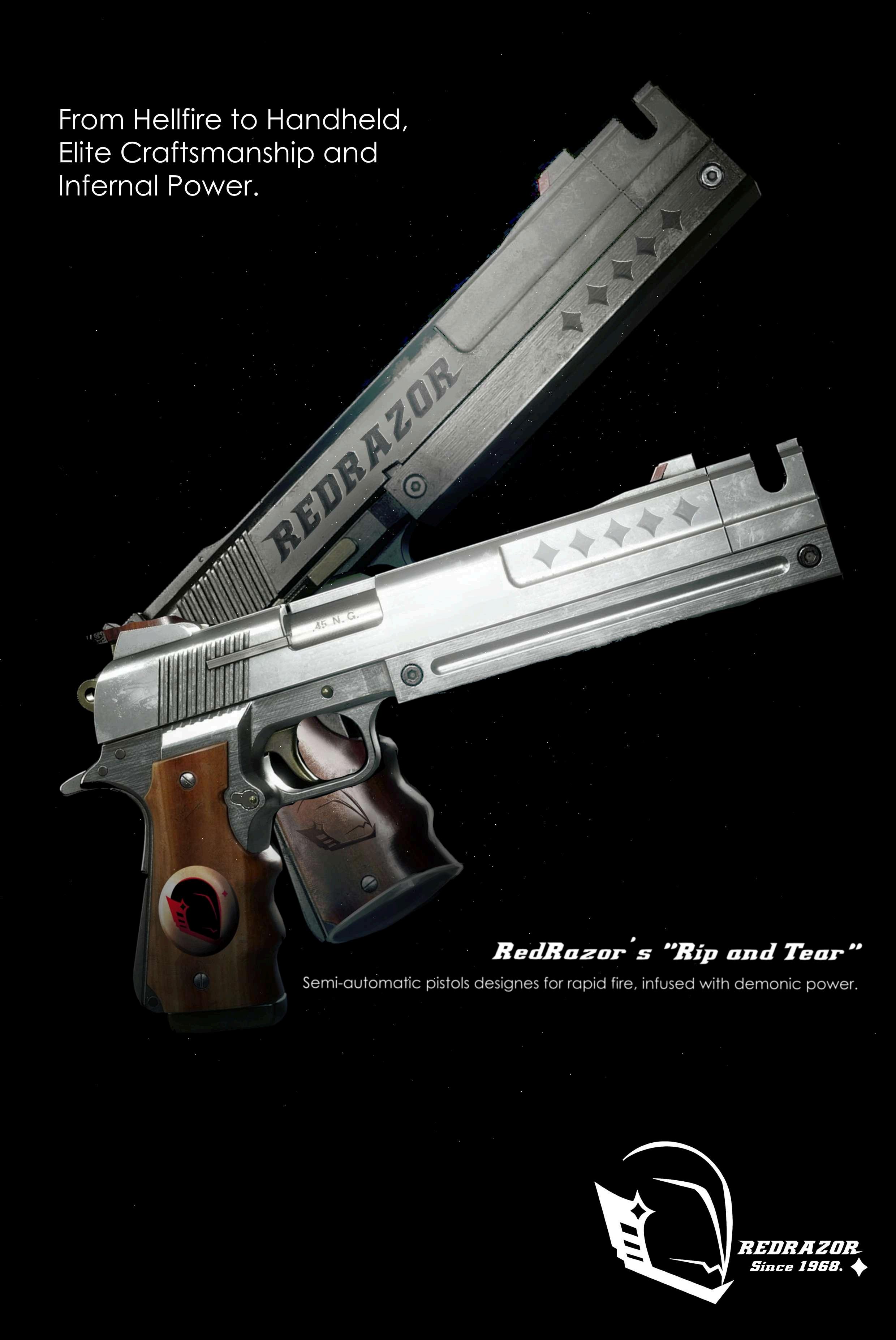 Ebony & Ivory are Dante's trademark pair of personally customized, semi-automatic pistols, designed to rapidly fire bullets instilled with his demonic power, and are one of the several firearms to appear in every Devil May Cry game series The left-handed black gun, Ebony, has been modified for long-distance targeting and comfort, while the right-handed white gun, Ivory, was custom built for rapid firing and fast draw times. These are Dante's trusty weapons Custom made just for him On the barrel of the Guns there's and engraving that says "For Tony Redgrave", which was Dante's old Fake name for his business