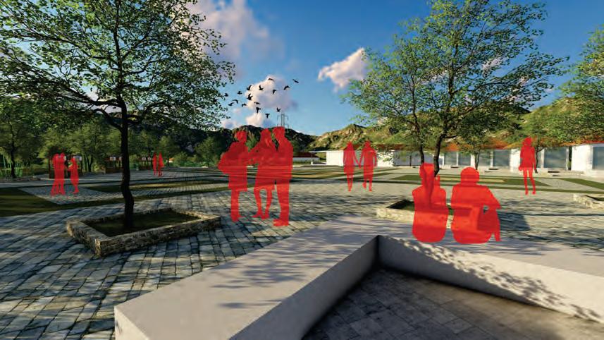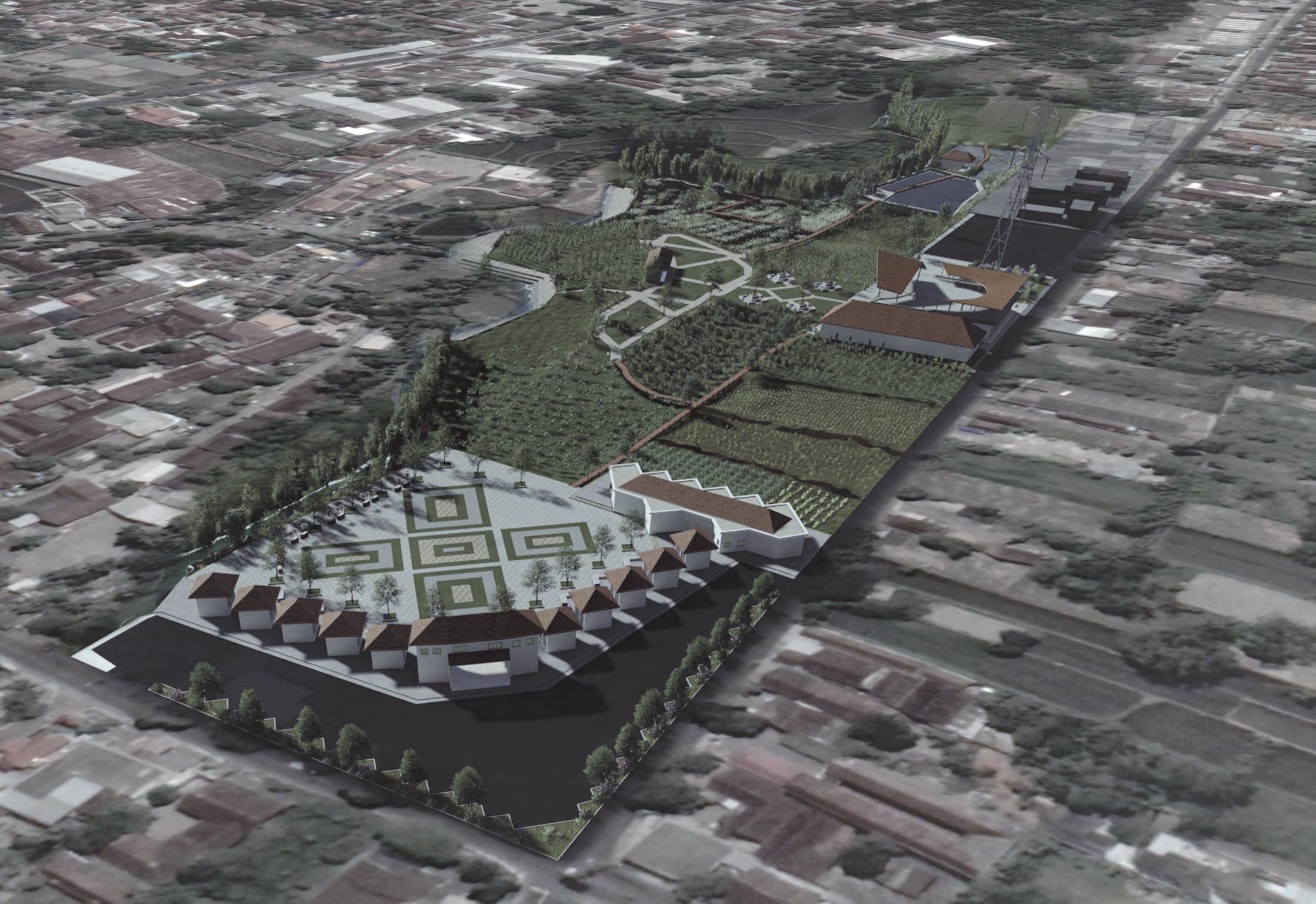 Perspektif mata burung visualisasi kawasan desain ruang publik dan taman tani
