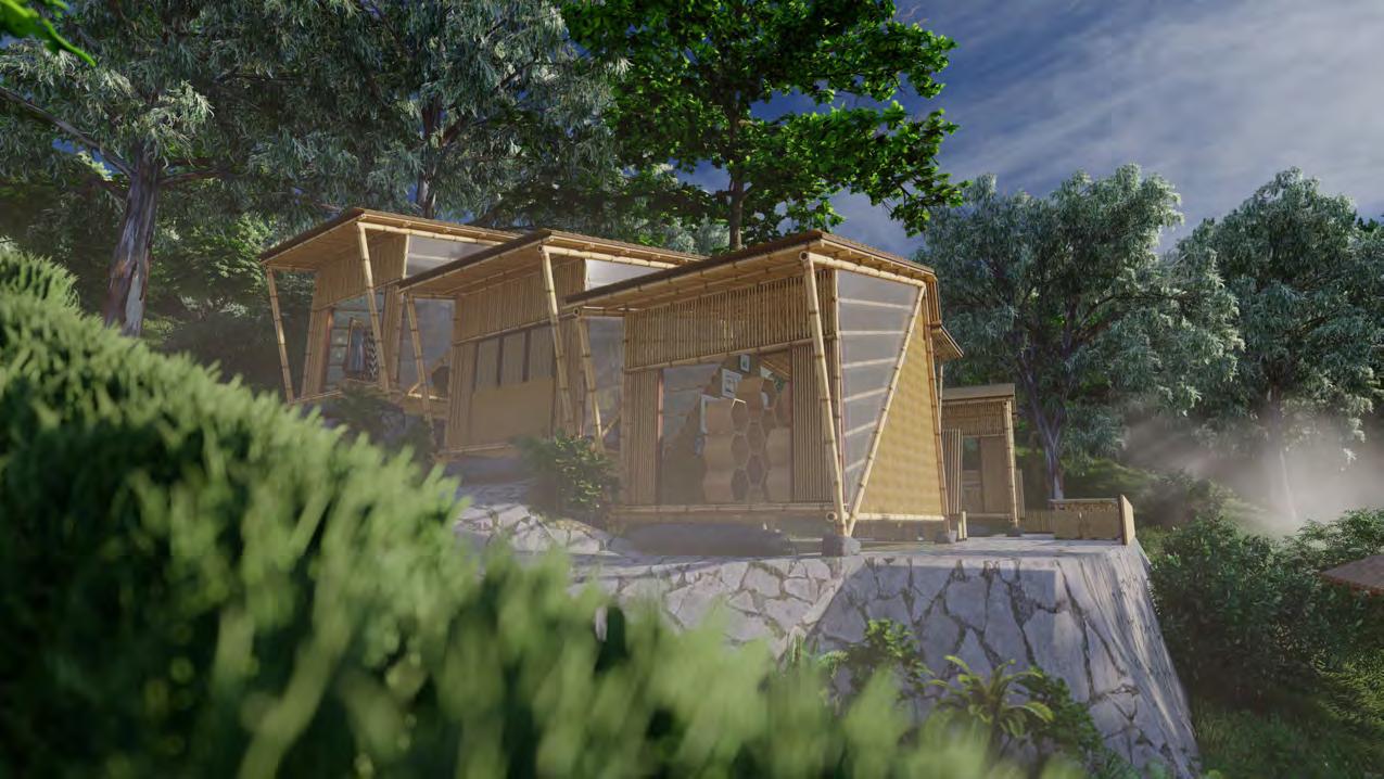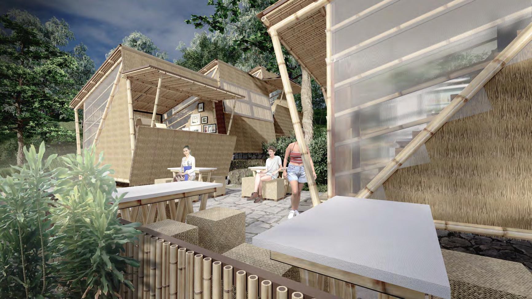 Struktur yang sederhana serta material dari sekitar lingkungan akan mengurangi emisi pada konstruksinya. Bambu dipilih sebagai material dominan karena keunikannya yang tahan kondisi lembab dan tersebar di seluruh wilayah.