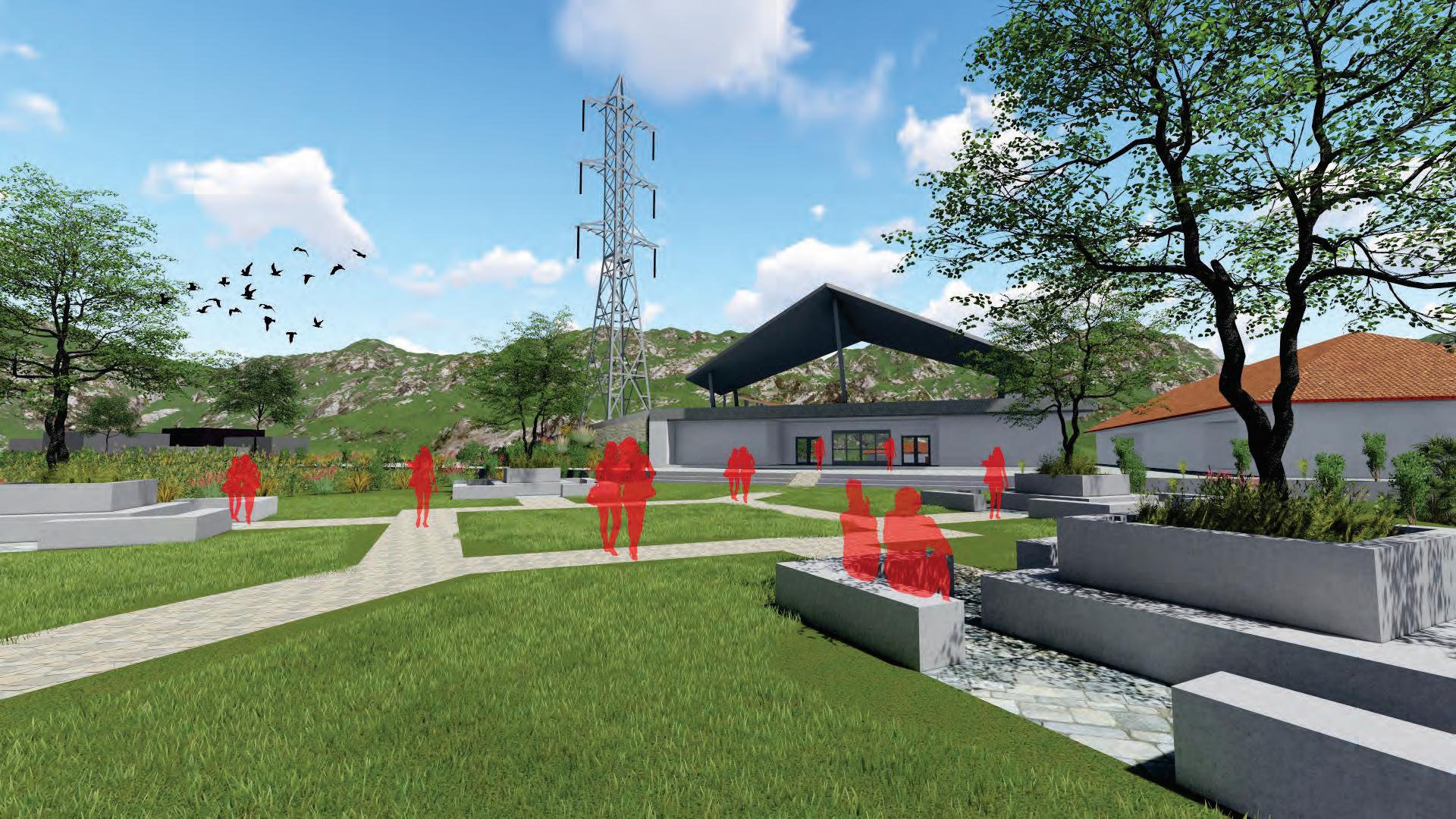 Proses konstruksi area site dilakukan penataan area berupa perkerasan beton, batu alam, kerikil, dan vegetasi.